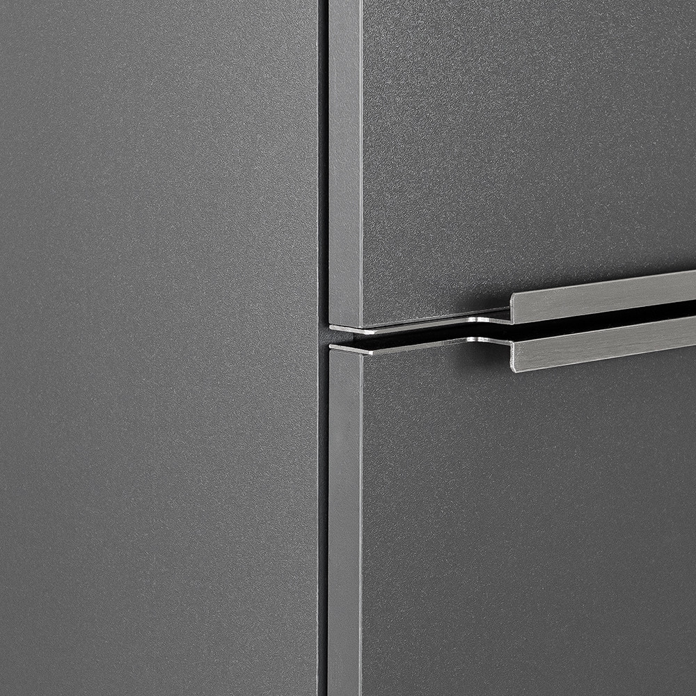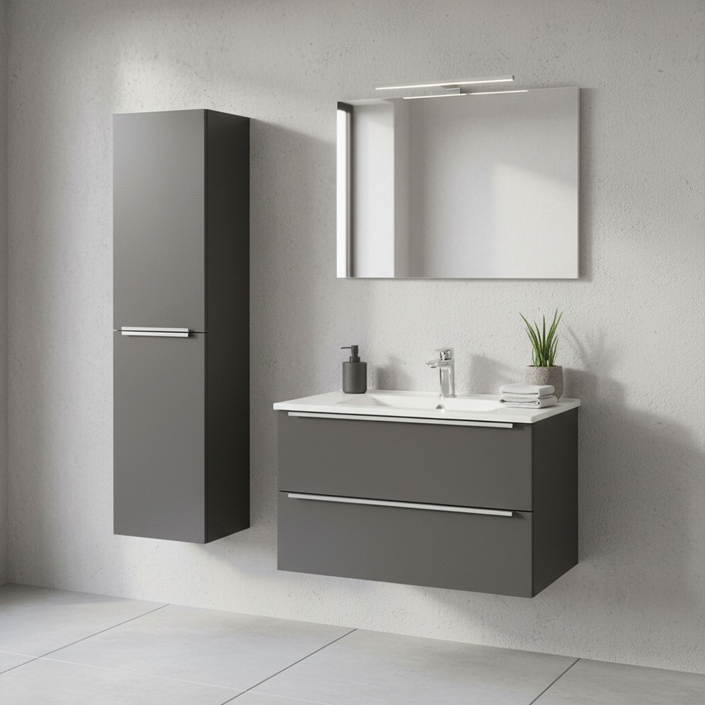 Dulapul lateral suspendat Vario Trim 35 oferă băii un aspect modern și curat, facilitând în același timp curățenia zilnică: podeaua este lăsată liberă dedesubt, făcând ca spațiul să pară mai spațios și mai ordonat. Ușa poate fi montată fie în stânga, fie în dreapta, ceea ce este deosebit de util în băile mai mici, unde fiecare centimetru contează. Dulapul este fabricat din panouri de mobilă durabile, care pot rezista umidității din utilizarea zilnică a băii. Profilul mânerului metalic Trim accentuează și mai mult caracterul elegant și modern al mobilierului; acesta oferă confort în utilizare și se îmbină armonios cu aspectul sofisticat al suprafețelor antracit.