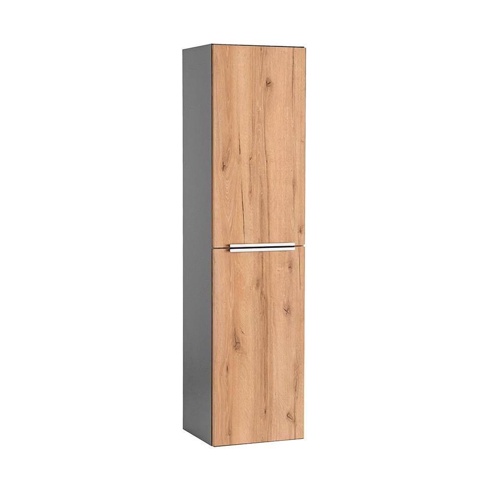 Dulapul lateral suspendat Vario Trim 35cu design suspendat oferă băii un aspect modern și curat, facilitând în același timp curățenia zilnică: podeaua este lăsată liberă dedesubt, făcând ca spațiul să pară mai spațios și mai ordonat. Ușa poate fi montată atât în stânga, cât și în dreapta, ceea ce este deosebit de avantajos în băile mici, unde fiecare centimetru contează.Dulapul este fabricat din panouri de mobilier durabile care rezistă la umiditatea zilnică din baie.Suprafețele sunt ușor de curățat. Profilul mânerului metalic Trim accentuează și mai mult caracterul elegant și modern al mobilierului; acesta oferă confort în utilizare și se îmbină armonios cu aspectul sofisticat al suprafețelor din stejar antracit.
