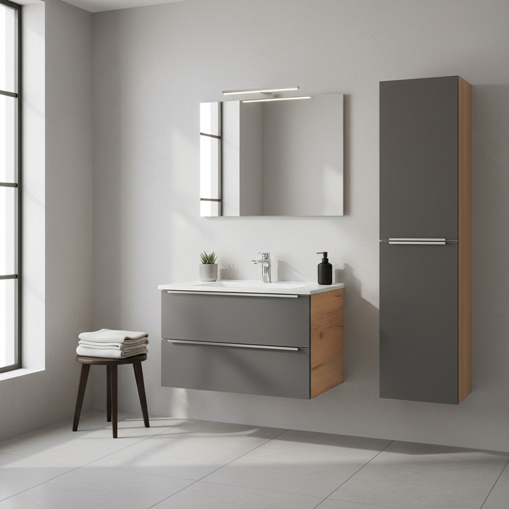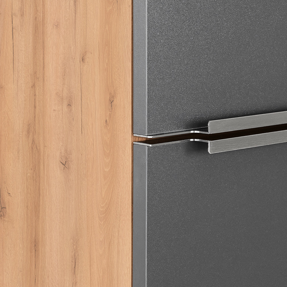 Dulapul lateral suspendat Vario Trim 35cu design suspendat oferă băii un aspect modern și curat, facilitând în același timp curățenia zilnică: podeaua este lăsată liberă dedesubt, făcând ca spațiul să pară mai spațios și mai ordonat. Ușa poate fi montată atât în stânga, cât și în dreapta, ceea ce este deosebit de avantajos în băile mai mici, unde fiecare centimetru contează.Dulapul este fabricat din panouri de mobilier durabile care rezistă la umiditatea zilnică din baie.Suprafețele sunt ușor de curățat. Profilul mânerului metalic Trim accentuează și mai mult caracterul elegant și modern al mobilierului; acesta oferă confort în utilizare și se îmbină armonios cu aspectul sofisticat al suprafețelor din stejar-antracit.