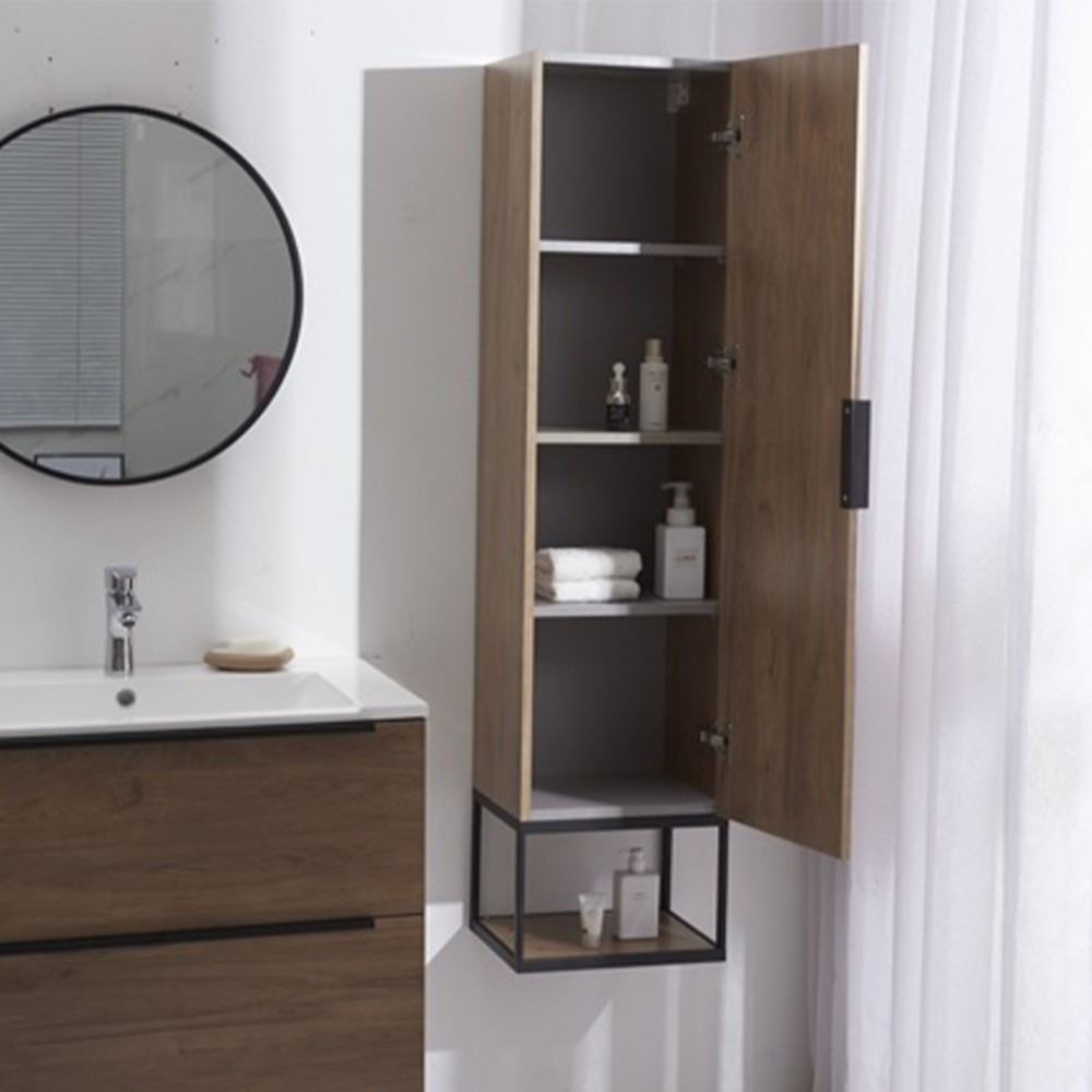 Cu mobilierul de baie Jersey, poți aduce o atmosferă mediteraneană în casa ta. Suprafața melaminată din nuc și picioarele și mânerele negre mate se combină pentru a crea o baie absolut modernă. Datorită tehnologiei de închidere silențioasă, ușa se închide silențios și ușor, crescând semnificativ durata de viață a mobilei.