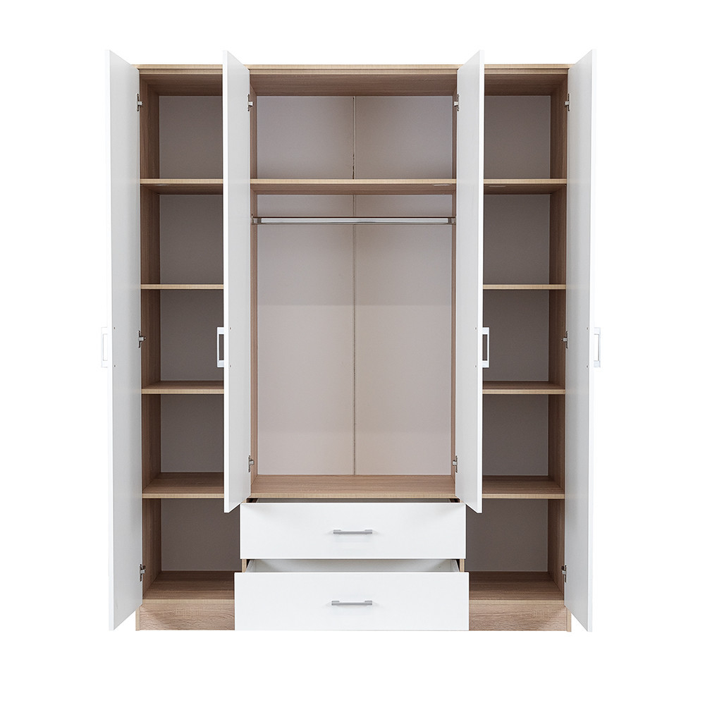 Elegantul față albă și corpul din stejar Sonoma cu efect de lemn Combinația sa creează o armonie perfectă atât în living, cât și în dormitor. THE 205 cm înălțime, 160 cm lățime și 55 cm adâncime Un dulap este o alegere ideală pentru oricine dorește să își organizeze hainele și accesoriile.