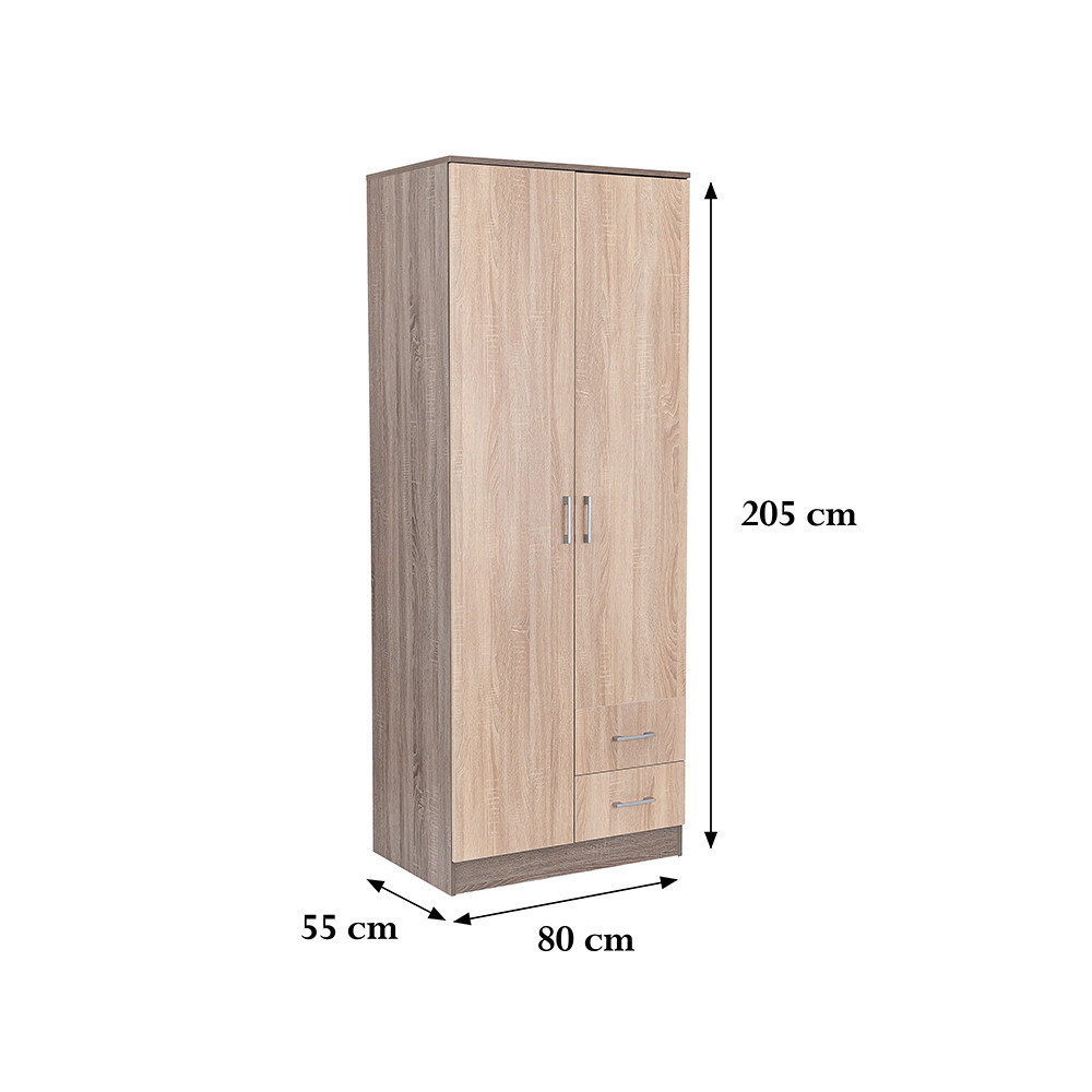 Combinația dintre eleganta față din stejar Sonoma și corpul din stejar York cu efect de lemn creează o armonie perfectă atât în sufragerie, cât și în dormitor. Dulapul cu înălțimea de 205 cm, lățimea de 80 cm și adâncimea de 55 cm este o alegere ideală pentru oricine dorește să își organizeze hainele și accesoriile.