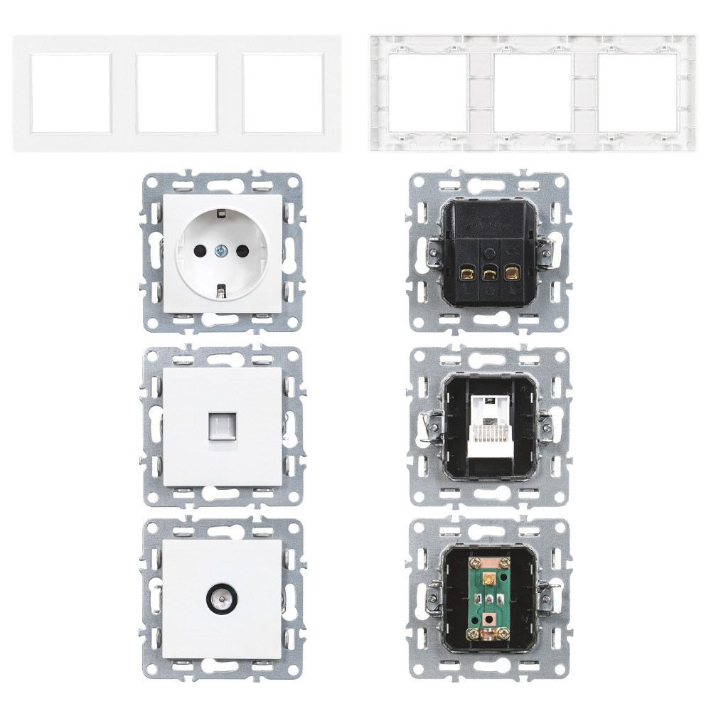 Set de prize triple Nova - priză cu împământare, UTP și priză TV într-unul singur, cu cadru alb curat