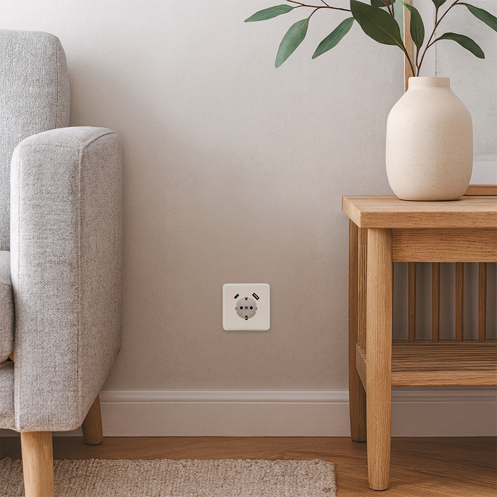 Priza cu împământare Nova cu priză de încărcare USB dublă integrată combină confortul unei conexiuni de rețea tradiționale de 230 V cu confortul încărcării USB. Priza cu împământare standard germană este proiectată pentru un curent nominal de 16 A și 250 V CA, în timp ce porturile USB pot furniza până la 2 A în total. Ideal pentru încărcarea dispozitivelor cu putere redusă (telefon mobil, căști, smartwatch) fără a fi nevoie de un adaptor separat. Produsul are un design încastrat, fixare cu șuruburi și se potrivește într-o cutie de montare standard. Designul său modular fără ramă permite instalarea în mai multe rame. Datorită gradului său de protecție IP20, acesta poate fi utilizat numai în medii interioare uscate și fără praf (de exemplu, sufragerie, dormitor, birou). Conectarea electrică trebuie efectuată de un electrician calificat în conformitate cu standardele relevante.