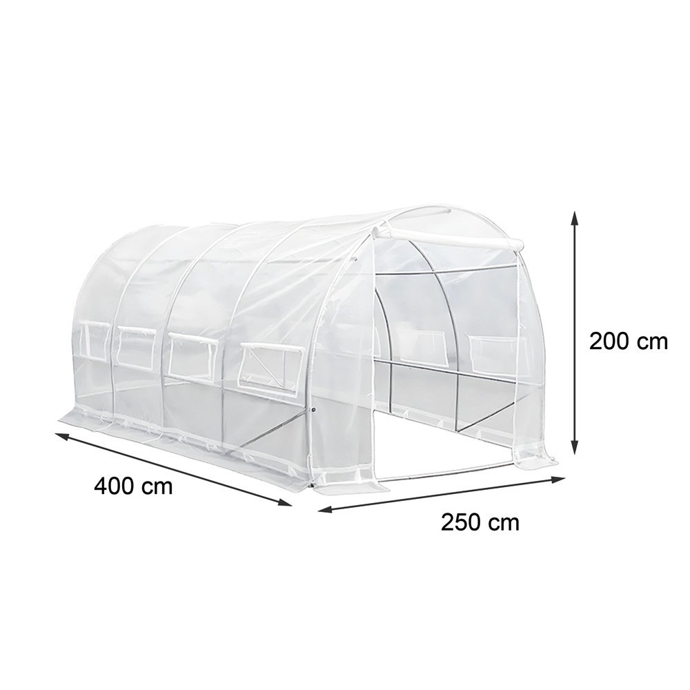 Dimensiunile cortului din folie de 200x250x400 cm oferă spațiu amplu pentru plantele tale. Folia durabilă, rezistentă la raze UV, garantează o durată lungă de viață și protecție împotriva intemperiilor. Produsul vine fără ramă, așa că puteți atașa cu ușurință folia la orice structură compatibilă sau ramă existentă. Tunelul modern din folie are o ușă rulantă, ceea ce crește semnificativ confortul de utilizare. În plus, cele 8 ferestre din plasă asigură o circulație adecvată a aerului, protejând în același timp eficient împotriva insectelor nedorite. Cortul din folie este ușor de instalat și întreținut, fiind o alegere ideală pentru utilizare sezonieră și protejând eficient plantele de lumina excesivă a soarelui, ploaie și vânt.