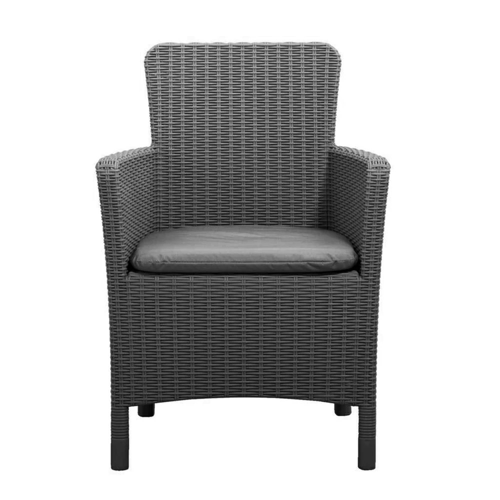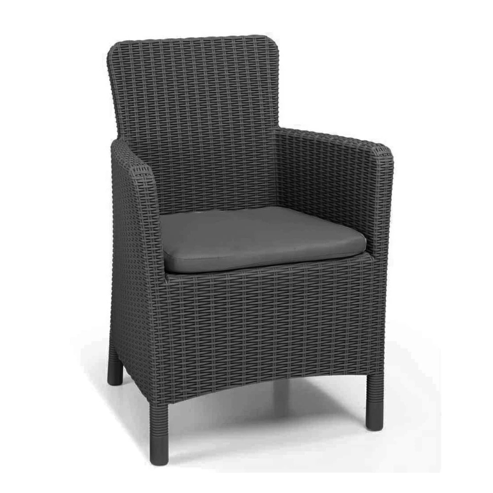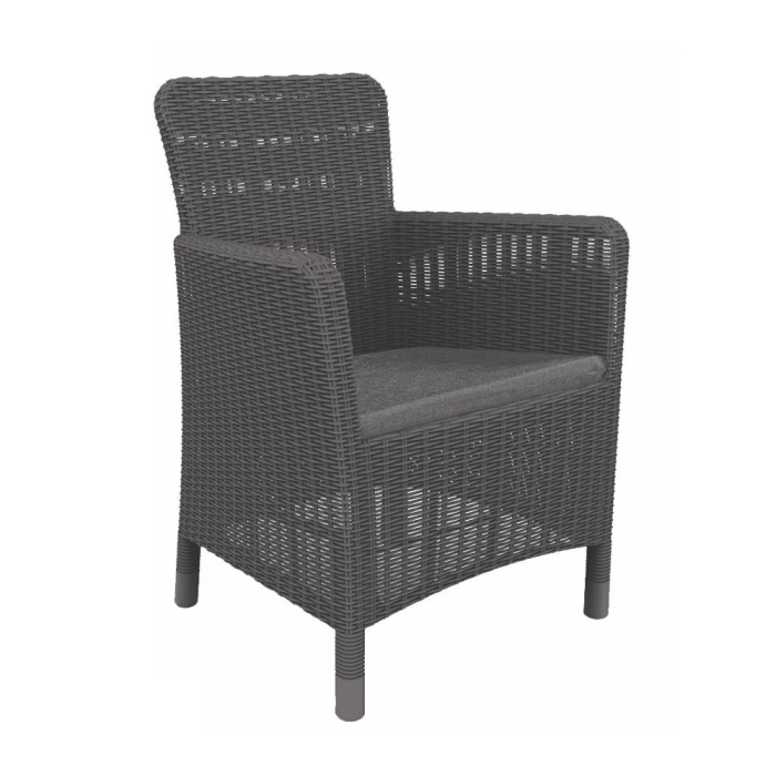 Fotoliul Trenton este fabricat din plastic cu efect de ratan, ceea ce îi conferă un aspect modern și elegant, fiind potrivit atât pentru mediile moderne, cât și pentru cele clasice.