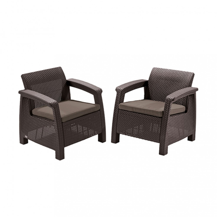 La prima vedere, poate părea că mobila este fabricată din ratan, dar de fapt este fabricată dintr-un plastic de înaltă calitate, care poate rezista la condiții meteorologice extreme. Pernele plate, cotierele late și spătarele conturate asigură confortul la utilizarea scaunelor de grădină. Producătorul de mobilă este marca Curver, care produce mobilier de grădină de înaltă calitate din plastic turnat prin injecție. Operează într-un grup cu mărcile bine-cunoscute și populare Keter și Allibert din Polonia. Mobila din Corfu este fabricată în fabrica companiei din Ungaria. Culoarea și designul uniform din cadrul seriei Corfu permit utilizarea fotoliilor Corfu Duo ca o completare a altor seturi din serie.