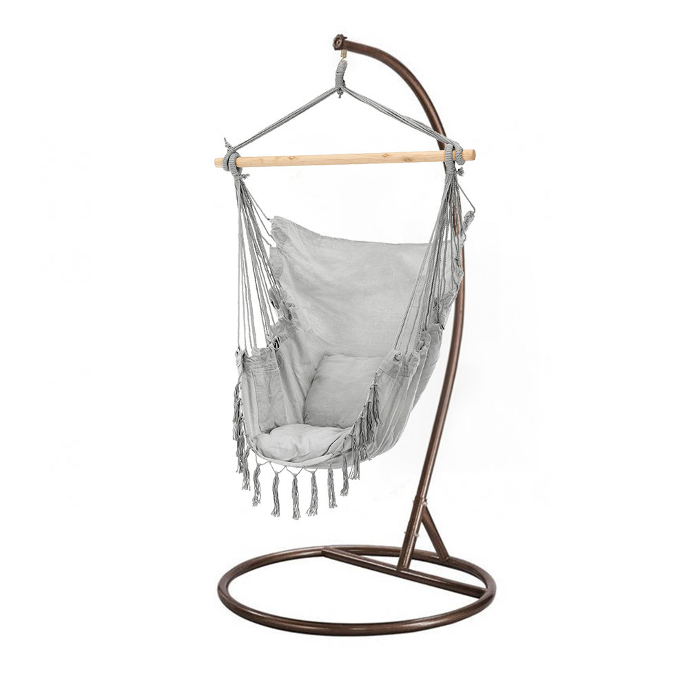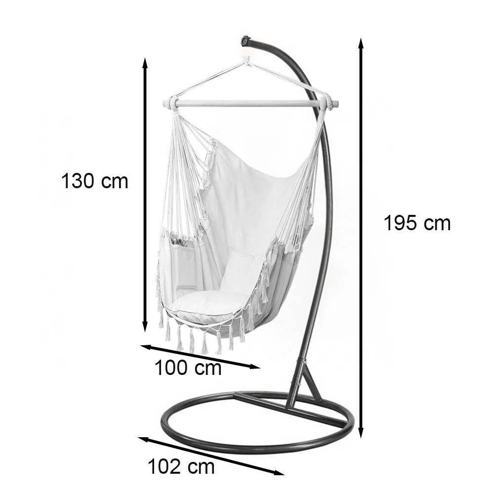 A barna színű függőfotel állvány masszív, időjárásálló acélból készült, így garantálja a hosszú távú használatot és tartósságot. A 195 cm magas, 102 cm átmérőjű alap stabil tartást biztosít még akkor is, ha teljes súllyal hintázol a székben.