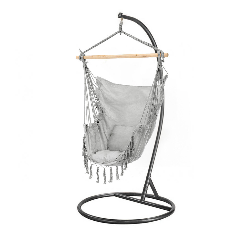 A fekete színű függőfotel állvány masszív, időjárásálló acélból készült, így garantálja a hosszú távú használatot és tartósságot. A 195 cm magas, 102 cm átmérőjű alap stabil tartást biztosít még akkor is, ha teljes súllyal hintázol a székben.