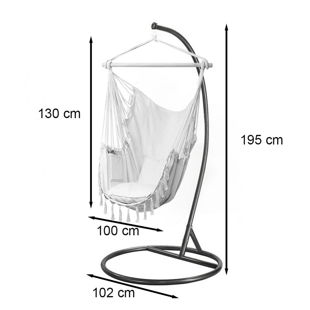 A barna színű függőfotel állvány masszív, időjárásálló acélból készült, így garantálja a hosszú távú használatot és tartósságot. A 195 cm magas, 102 cm átmérőjű alap stabil tartást biztosít még akkor is, ha teljes súllyal hintázol a székben.