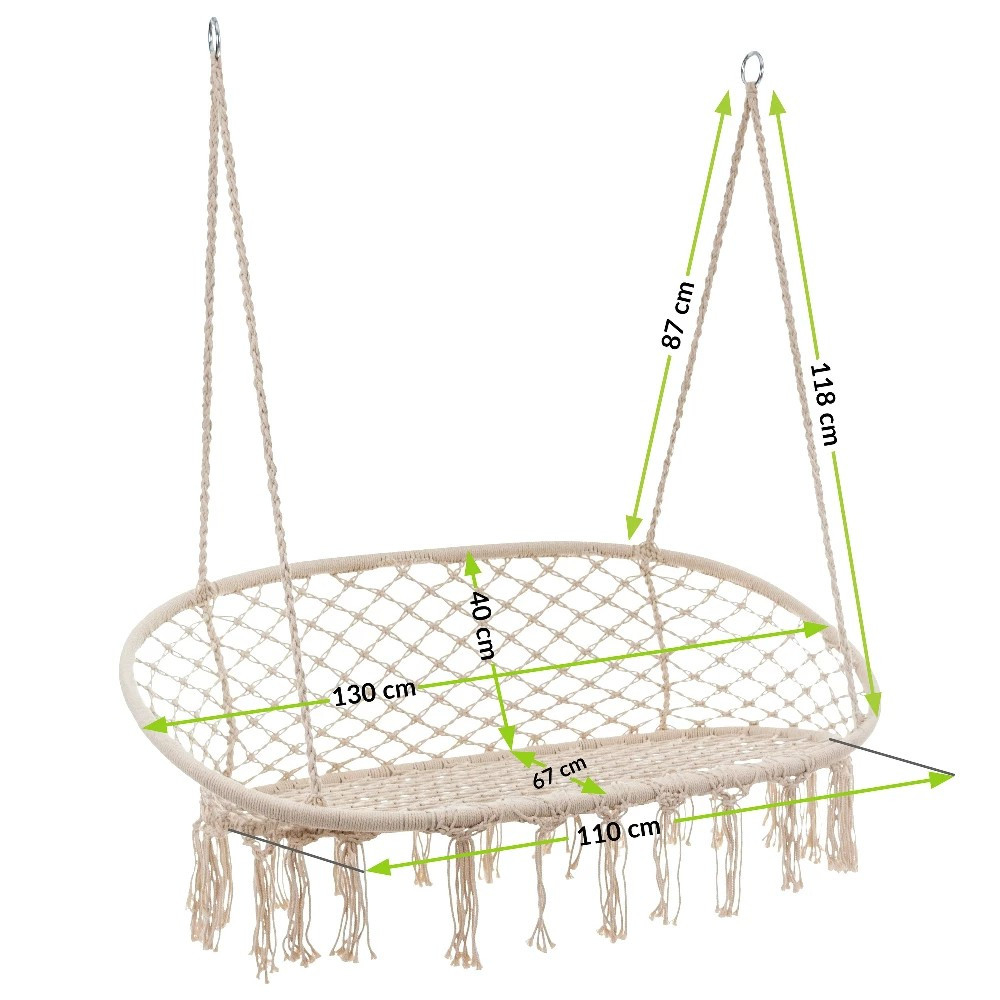 Datorită dimensiunilor sale mari, leagănul boho poate fi folosit cu ușurință de două persoane. Un avantaj special al scaunului brazilian este spătarul înalt , care crește semnificativ confortul șezutului. Setul include frânghii și inele metalice. Furnizarea de elemente suplimentare de asamblare este responsabilitatea clientului și depinde de locația aleasă (de exemplu, tavanul în casă, grinda în pavilion). Pernele din imagine nu sunt incluse în set.
