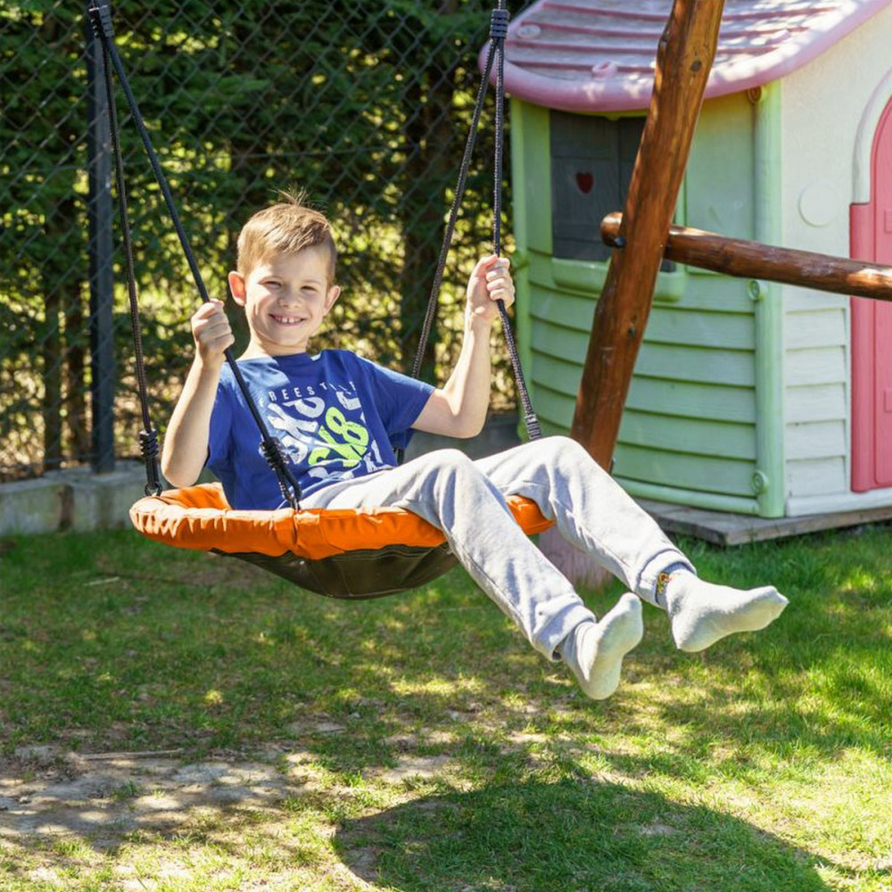 Lungimea reglabilă a frânghiilor durabile vă permite să ajustați înălțimea în funcție de înălțimea și vârsta utilizatorului. Structura cadrului balansoarului pentru copii are o husă din spumă care reduce riscul de coliziune în timpul jocului. Protecție suplimentară este oferită de capacele de la conexiunile dintre frânghii și structura scaunului, crescând și mai mult nivelul de siguranță pentru copilul dumneavoastră. Leagănul de grădină are un șezut fabricat din covoraș PP negru, care este foarte rezistent la murdărie și deteriorări. Leagănele de cuib arată bine în orice mediu. Datorită materialelor folosite, îngrijirea balansoarului suspendat este fără probleme.
