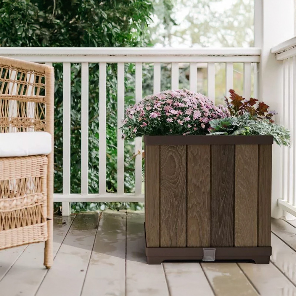 Cutia din plastic de culoarea nucului, realizată cu tehnologia DecoCoat™, arată înșelător ca lemnul adevărat, dar această cutie pentru flori nu trebuie vopsită, lăcuită sau uleiată. Nu se deformează, nu crăpă și este rezistent la radiațiile UV și la ploaie. Această cutie cu flori nu este doar un instrument practic pentru plante, ci și un plus elegant pentru terasa, balconul, zona de la intrare sau chiar în interior.