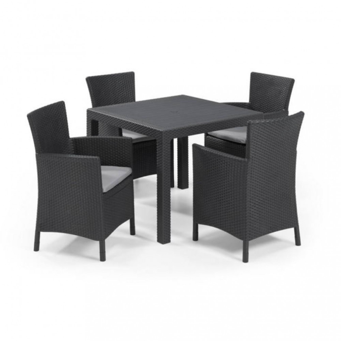 Set de mobilier de grădină Quartet; include o masă Quartet și patru fotolii Iowa cu perne asortate. Finisajul original; de tip rattan va satisface chiar și cei mai exigenți utilizatori. Produsul este foarte ușor de asamblat și întreținut. Suprafața mobilierului este rezistentă la umiditate și radiații UV; ceea ce garantează o durată lungă de viață. Mobilierul din rattan vine asamblat pe o placă.