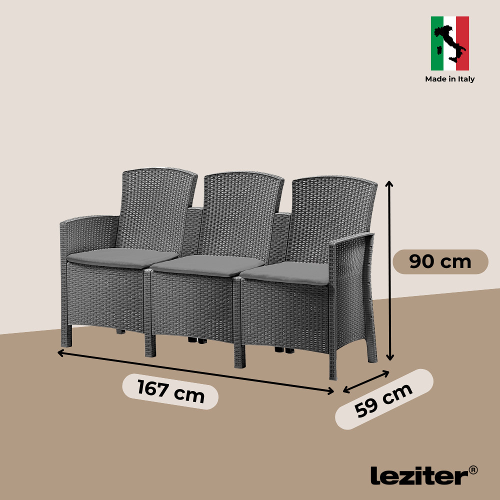 Datorită culorii grafit și texturii originale cu efect de ratan, această canapea se potrivește cu ușurință în grădini, terase sau chiar în zone de restaurante în stil modern și clasic. Dimensiunile sale compacte (167 x 59 x 90 cm) îi permit să arate bine pe terase mai mici, oferind în același timp suficient spațiu pentru ședere confortabilă.
