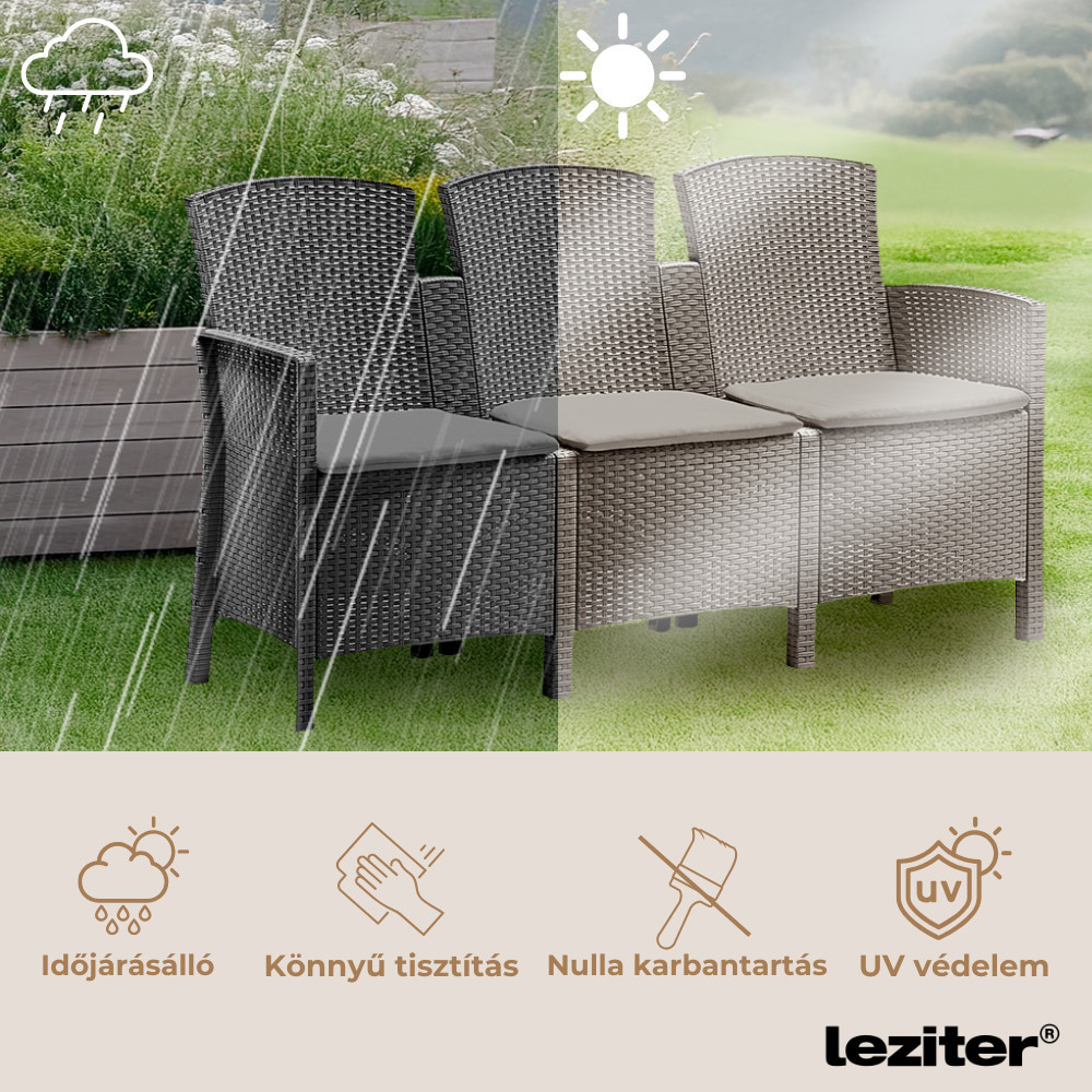 Mobilierul de grădină este așteptat să rămână frumos și confortabil timp de mulți ani. Canapeaua Lima combină beneficiile ratanului artificial cu un aspect elegant și curat. Datorită materialului rezistent la UV și intemperii, nu trebuie să vă faceți griji în privința ploii sau a soarelui arzător. Suprafața ușor de curățat și durabilă vă permite să vă bucurați de confortul său ani de zile, fără a fi nevoie de întreținere.