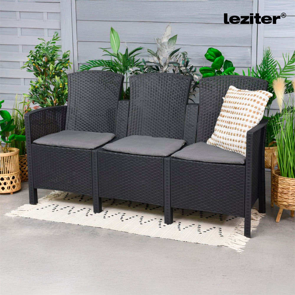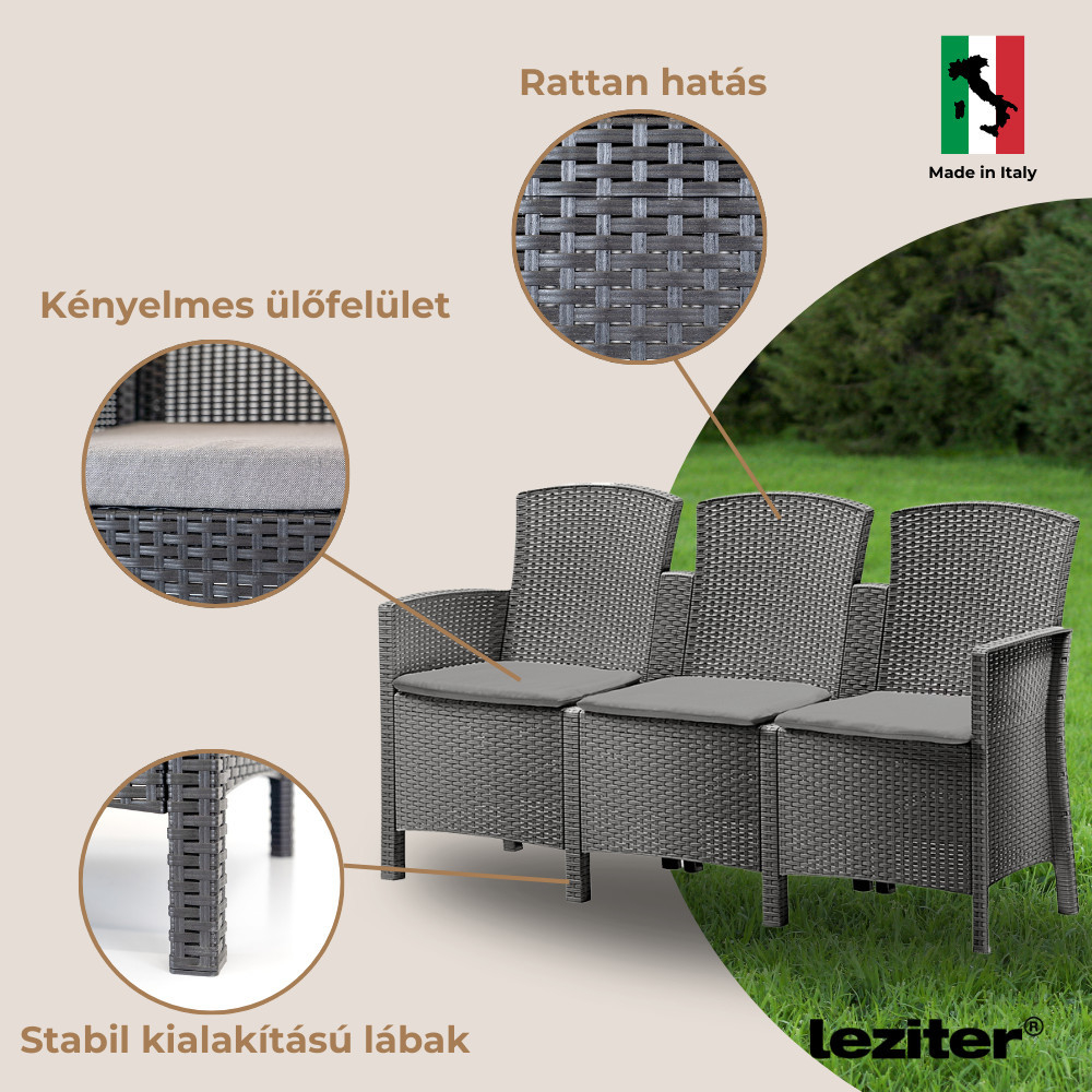 Canapeaua de grădină Lima cu 3 locuri este dotată cu perne de șezut moi, asortate în culori, care oferă un confort suplimentar. Designul ergonomic al spătarului oferă o postură perfectă, astfel încât să puteți petrece confortabil pe el perioade mai lungi de timp. Fie că este vorba de o seară de vin sau de o conversație în familie, toată lumea se va bucura să se relaxeze pe această canapea. Poate găzdui confortabil trei persoane, fiind o alegere perfectă pentru întâlniri cu prietenii, grătare sau pur și simplu pentru relaxare în grădină.