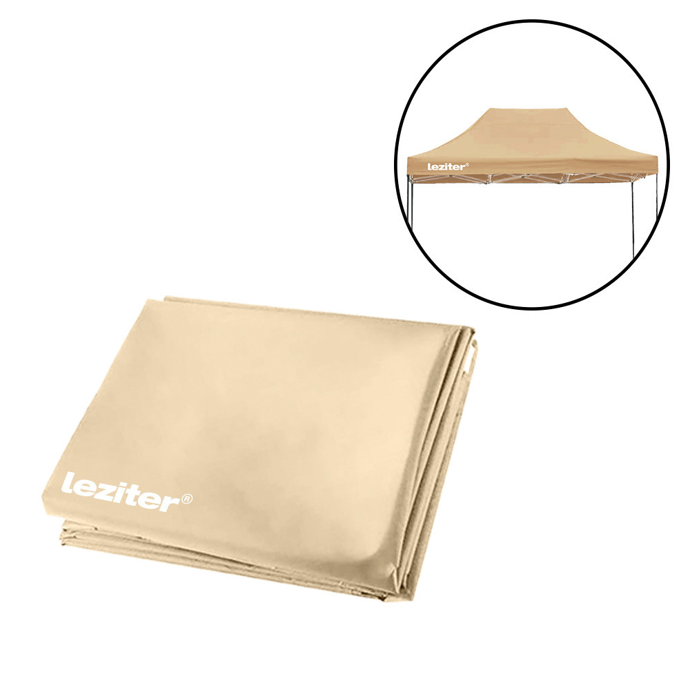Copertina pentru foișor Leziter de 3x4,5 m este fabricată din țesătură Oxford 420D, care este hidrofugă și rezistentă la UV datorită învelișului său din PVC. Logo-ul Leziter de pe patru laturi oferă un aspect sofisticat oricărui eveniment. Culoarea bej este elegantă, armonizându-se cu stilul grădinii dumneavoastră. Această copertină este ușor de înlocuit, astfel încât să puteți reînnoi acoperișul foișorului dvs. în câteva momente înainte de o invitație bruscă sau de un eveniment planificat.