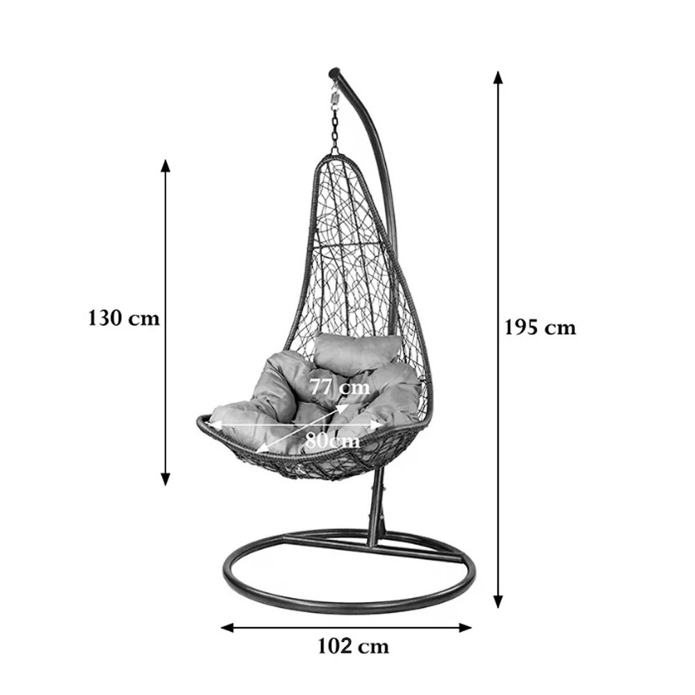 Fotoliul vine cu o pernă gri moale din două piese, cu o husă de pernă impermeabilă detașabilă pentru o curățare ușoară.Structura cadrului de 195 cm înălțime și 102 cm diametru și coșul de 130 cm înălțime, 80 cm lățime și 77 cm adâncime a scaunuluioferă un loc confortabil pentru relaxare.