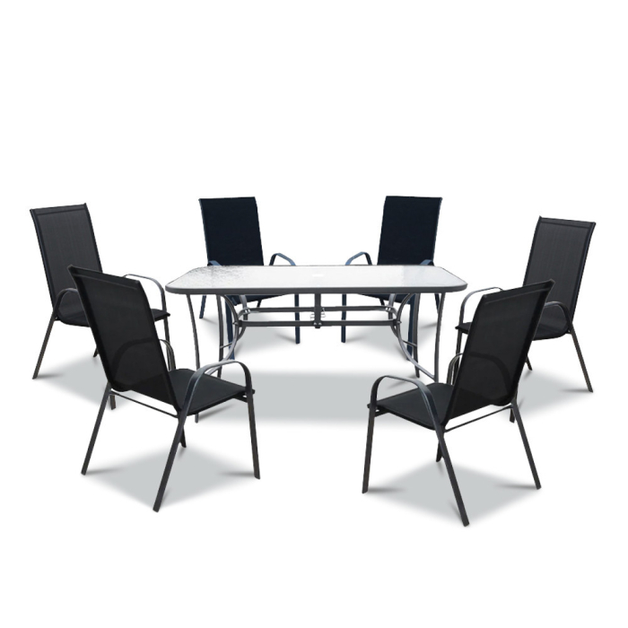 Set de mobilier de grădină cu un design modern, care include o masă de grădină cu blat din sticlă și 6 scaune. Mobilierul este proiectat pentru 6 persoane. Scaunele au o capacitate de încărcare de 120 kg. Scaunele și baza mesei sunt fabricate din metal. Blatul mesei este fabricat din sticlă călită de 5 mm, care este rezistentă la zgârieturi minore. Materialul scaunului din textilenă este rezistent la condițiile meteorologice. Acesta are avantajul unui scaun și al unui cotieră profilate ergonomic, care ușurează umerii atunci când vă relaxați.