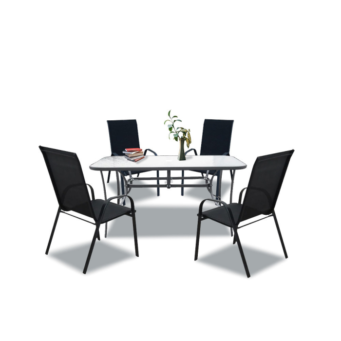 Setul de mobilier este proiectat pentru a găzdui 4 persoane, permițându-vă să utilizați mobilierul în timpul întâlnirilor cu cei dragi. Acesta este proiectatla înălțimea potrivită pentru a mânca confortabil prânzul sau alte mese. O gaură suplimentară a fost încorporată în structura mesei pentru a stabiliza umbrela. Designul simplu al picioarelor larg distanțate asigură stabilitatea.