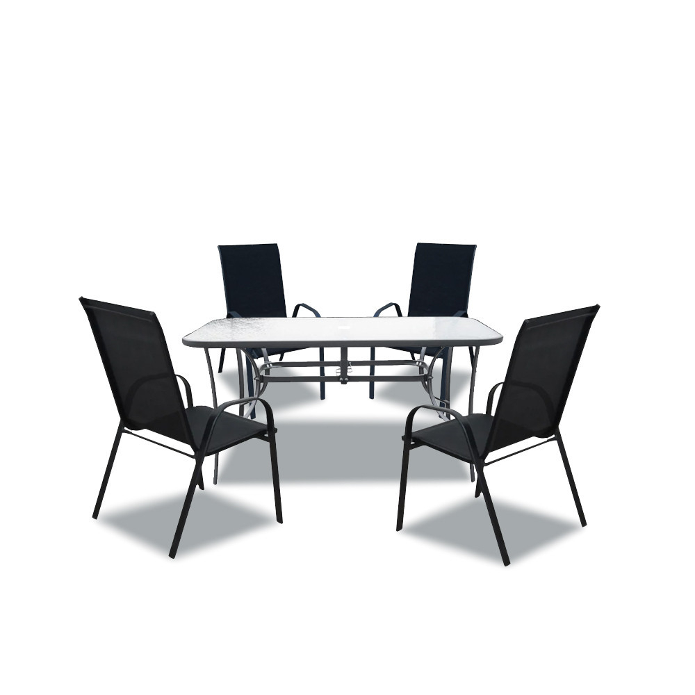 Acest set modern de mobilier de grădină include o masă de grădină cu blat din sticlă și 4 scaune cu o capacitate de încărcare de 120 kg. Mobilierul este proiectat pentru 4 persoane. Scaunele și baza mesei sunt fabricate din metal. Blatul mesei este fabricat din sticlă călită de 5 mm, care este rezistentă la zgârieturi minore. Materialul scaunului din textilenă este rezistent la condițiile meteorologice. Acesta are avantajul unui scaun și al unui cotieră profilate ergonomic, care ușurează umerii atunci când vă relaxați.