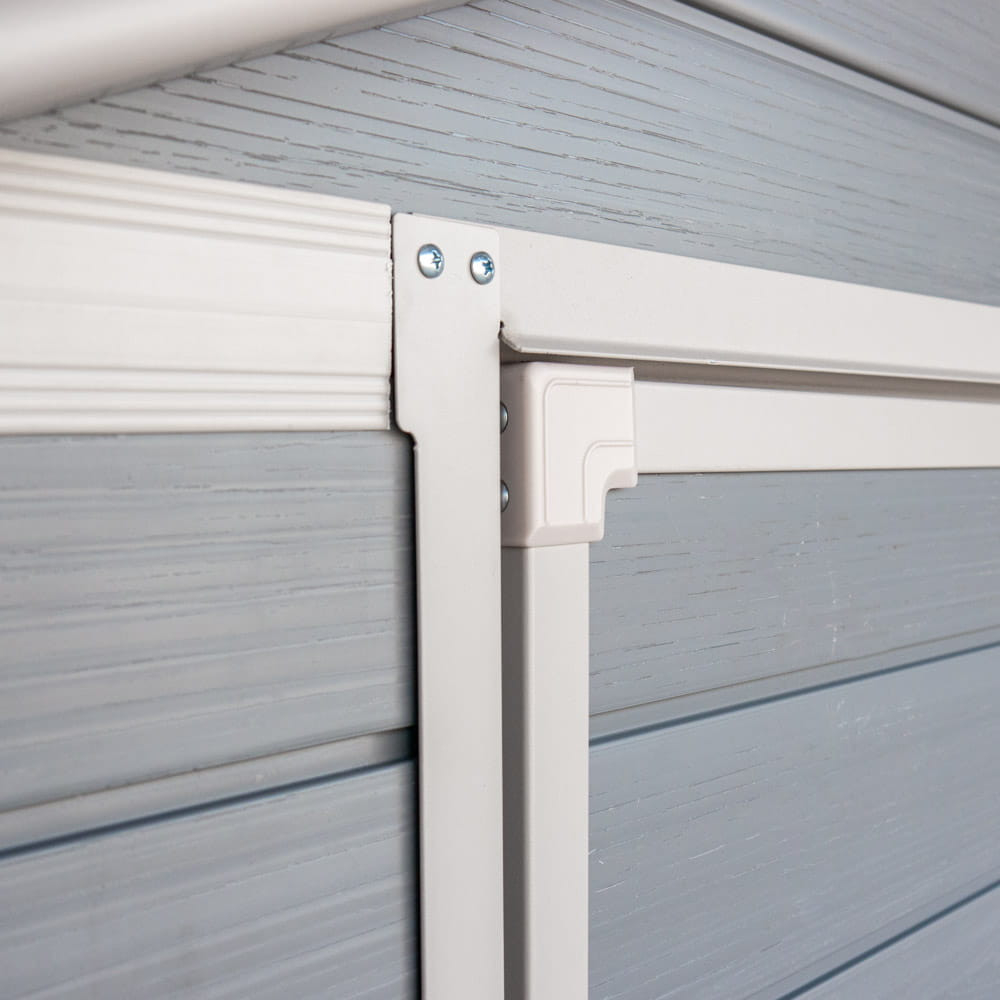 - Șopronul de unelte are un acoperiș în două ape, impermeabil, care protejează împotriva ploii și zăpezii.