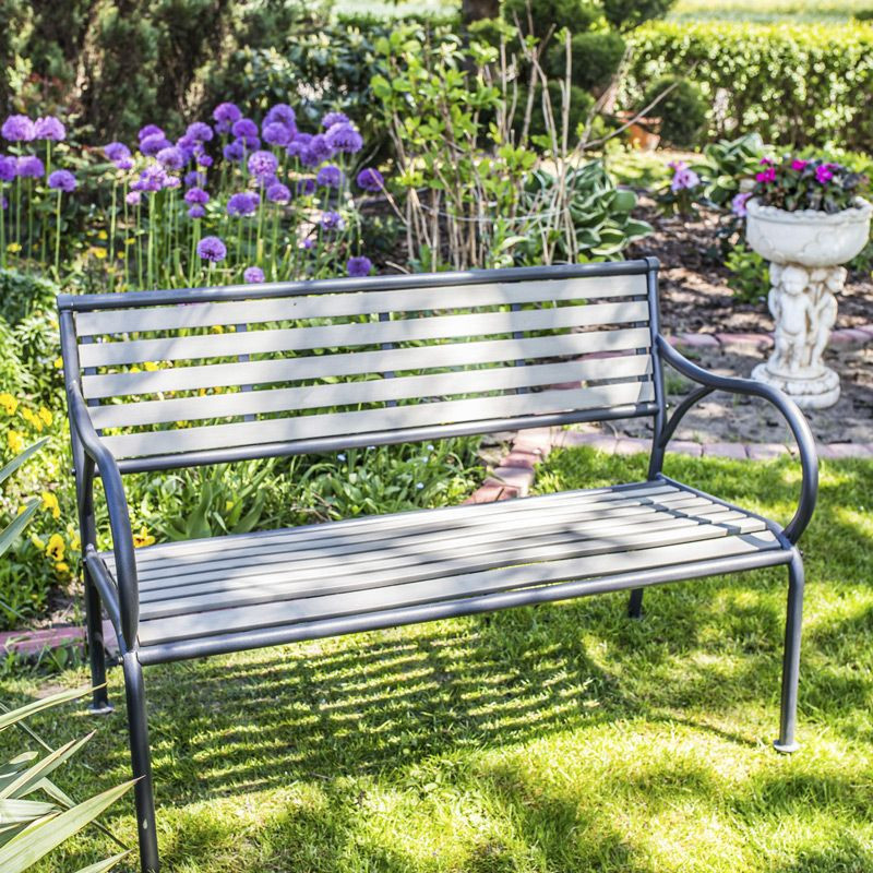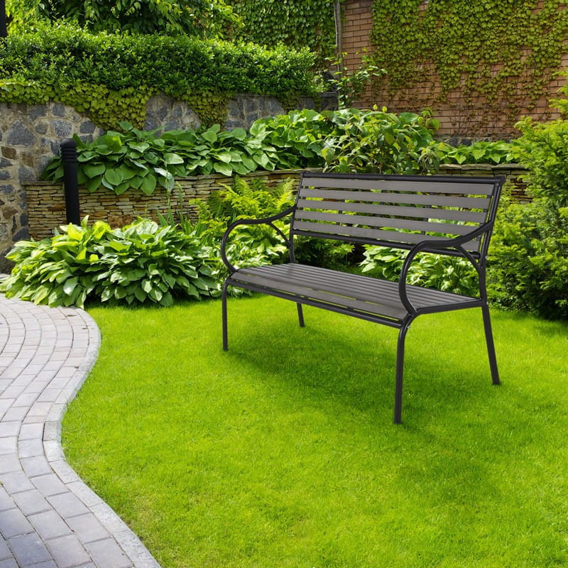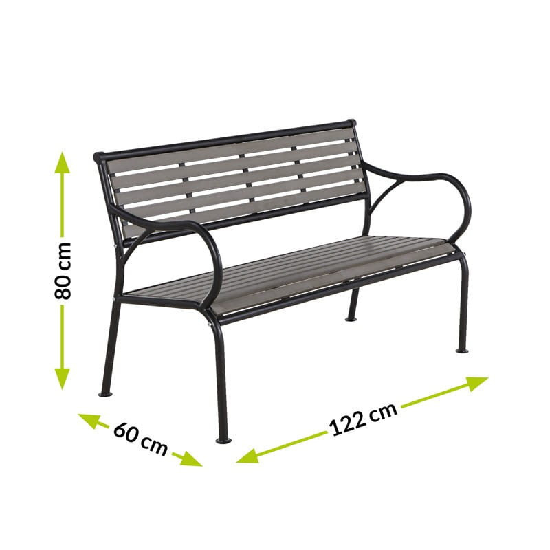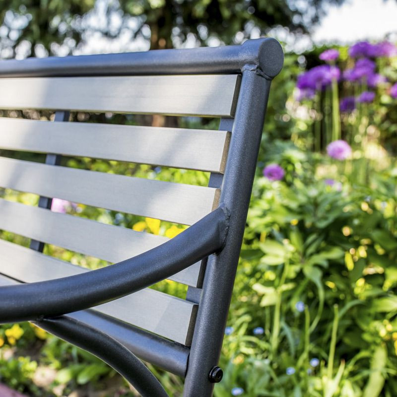 Banca de parc este fabricată din oțel galvanizat acoperit cu pulbere pentru a rezista la intemperii.