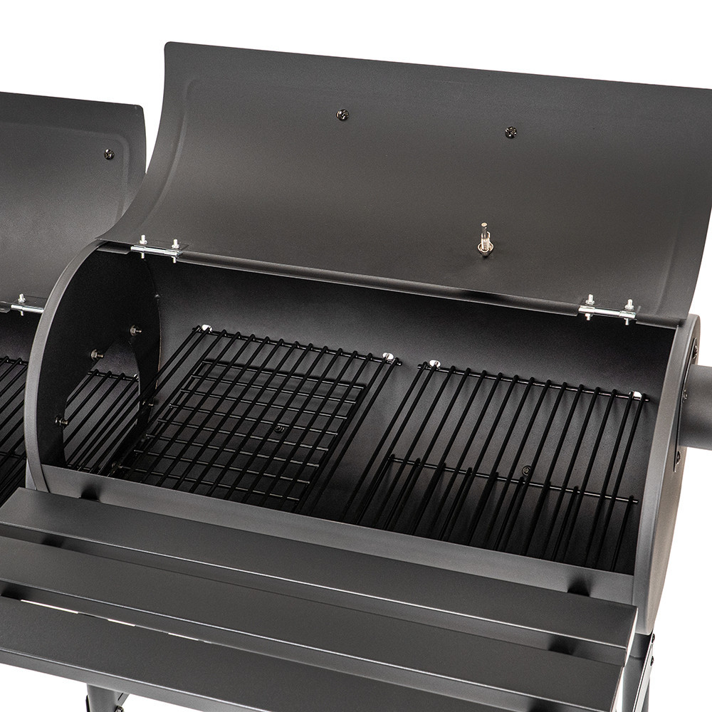 Designul cu două camere permite grătarul și afumarea separate. Fumul care iese din camera de afumare pătrunde uniform în mâncare, oferindu-i o aromă mai bogată. Construcția din oțel și controlul precis al temperaturii asigură o experiență perfectă la grătar.