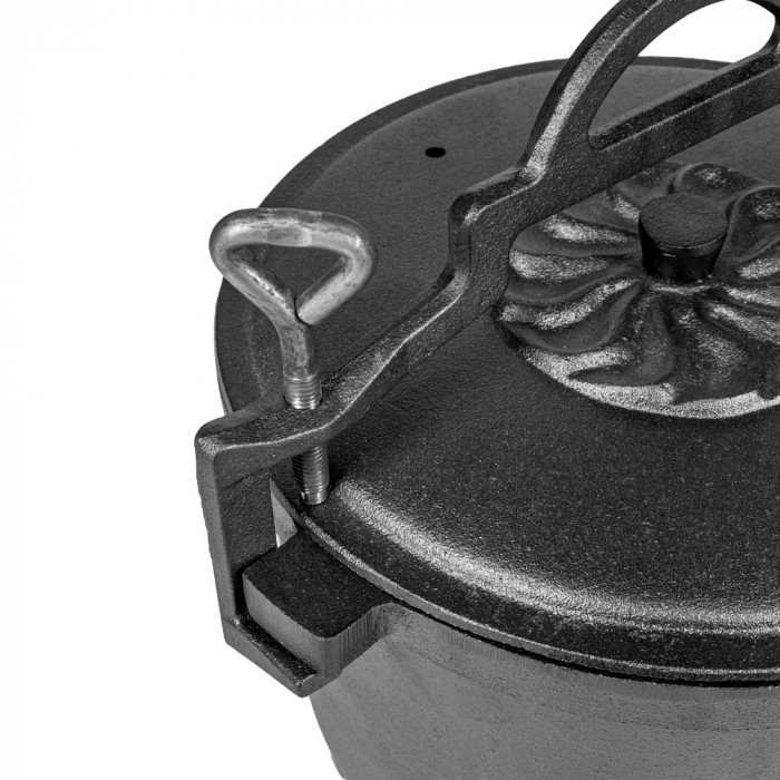 Oala din fontă este echipată cu un capac pentru a asigura prepararea ușoară a alimentelor și pentru a menține temperatura potrivită. Capacul nu numai că protejează împotriva pierderilor de căldură, dar previne și vărsarea grăsimii, făcând gătitul mai curat și mai convenabil.