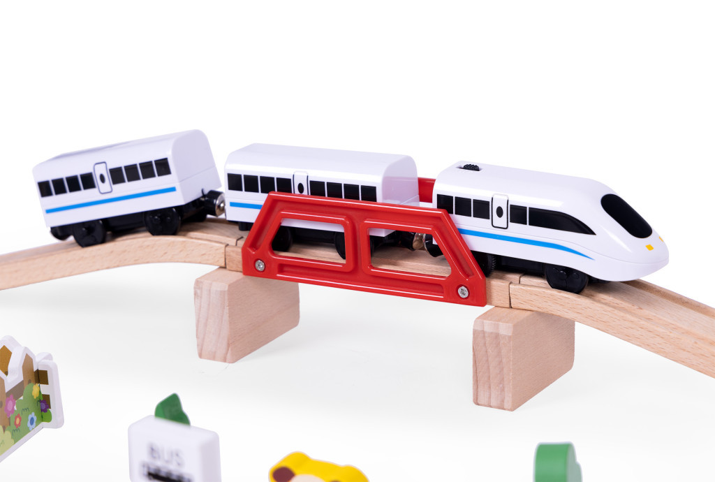Datorită **elementelor diferite**, cum ar fi indicatoarele rutiere, podul, ferma și moara de vânt, **fiecare zi poate fi diferită cu acest tren. Datorită posibilității de a conecta liber șinele, copilul dvs. poate crea un număr infinit de rute și scenarii diferite. Trenul reprezintă o mare distracție creativă pentru mai mulți copii în același timp, permițând întregii familii, prietenilor și colegilor să se alăture distracției. Pe lângă distracție, copilul dvs. va avea, de asemenea, ocazia să se joace ca mecanic de tren, dezvoltându-și imaginația și dexteritatea.