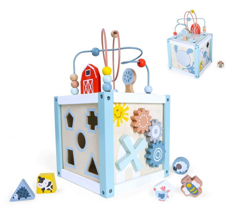 • Pe partea laterală a peretelui, copilul se poate juca cu sortatorul prin potrivirea cuburilor de forma potrivită. Pereții succesivi ai cubului au o oglindă, un labirint și unelte rotative.