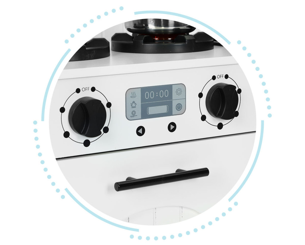 Bucătăria este dotată cu butoane rotative care vă permit să simulați funcționarea aragazului și a cuptorului. Copiii pot controla temperatura, pot schimba setările arzătoarelor, permițându-le să creeze scenarii diferite și să facă mâncăruri de joacă fără riscul de a se arde. Aceasta este o mare oportunitate pentru jocul creativ și experimentarea într-un mediu sigur.
