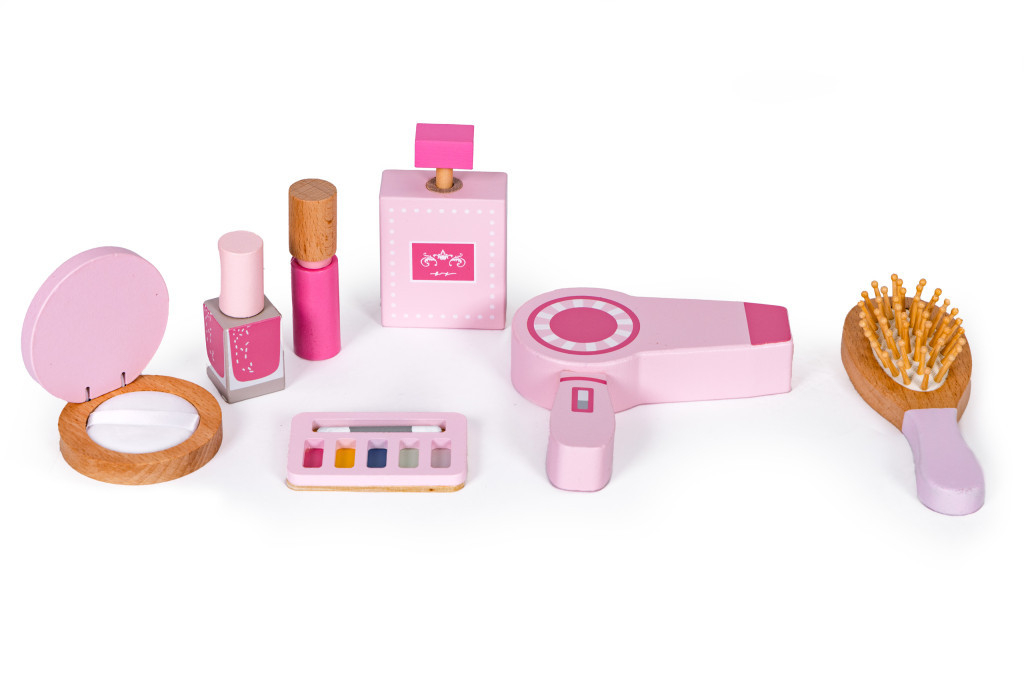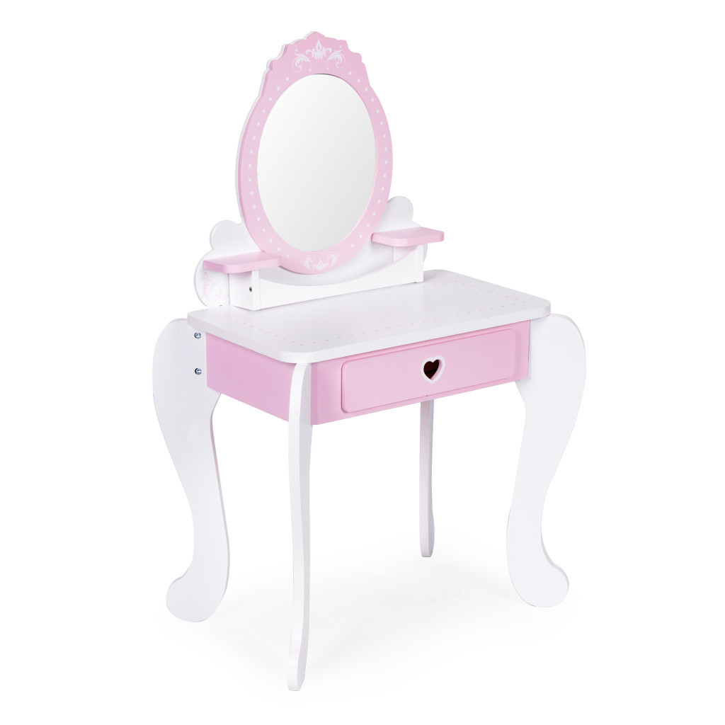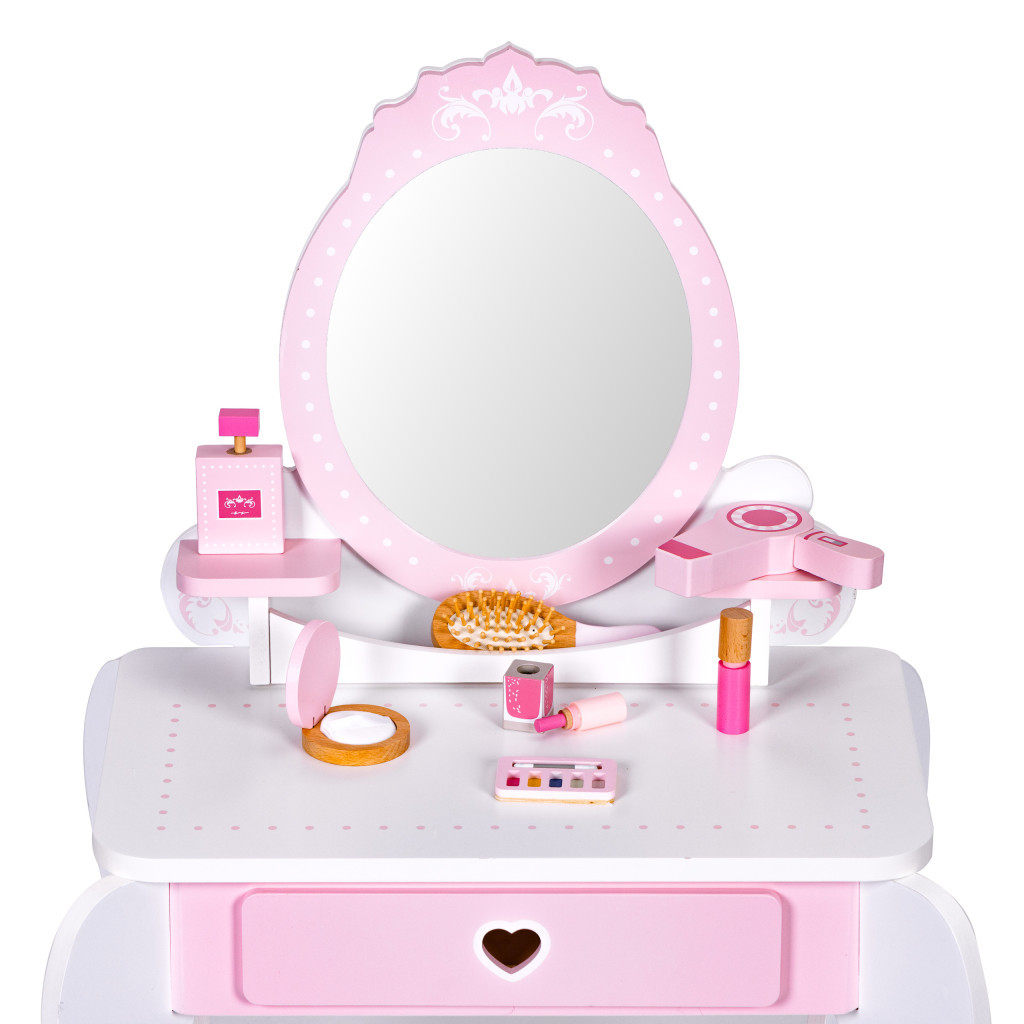 Măsuța de toaletă este concepută astfel încât fetițele să o poată imita pe mama lor în ritualurile zilnice de frumusețe. Dotată cu accesorii realiste și o oglindă mare decorativă, este visul devenit realitate al oricărui mic make-up artist. Datorită jucăriei, copiii își vor dezvolta dexteritatea și imaginația și vor avea ocazia să învețe elementele de bază ale machiajului.