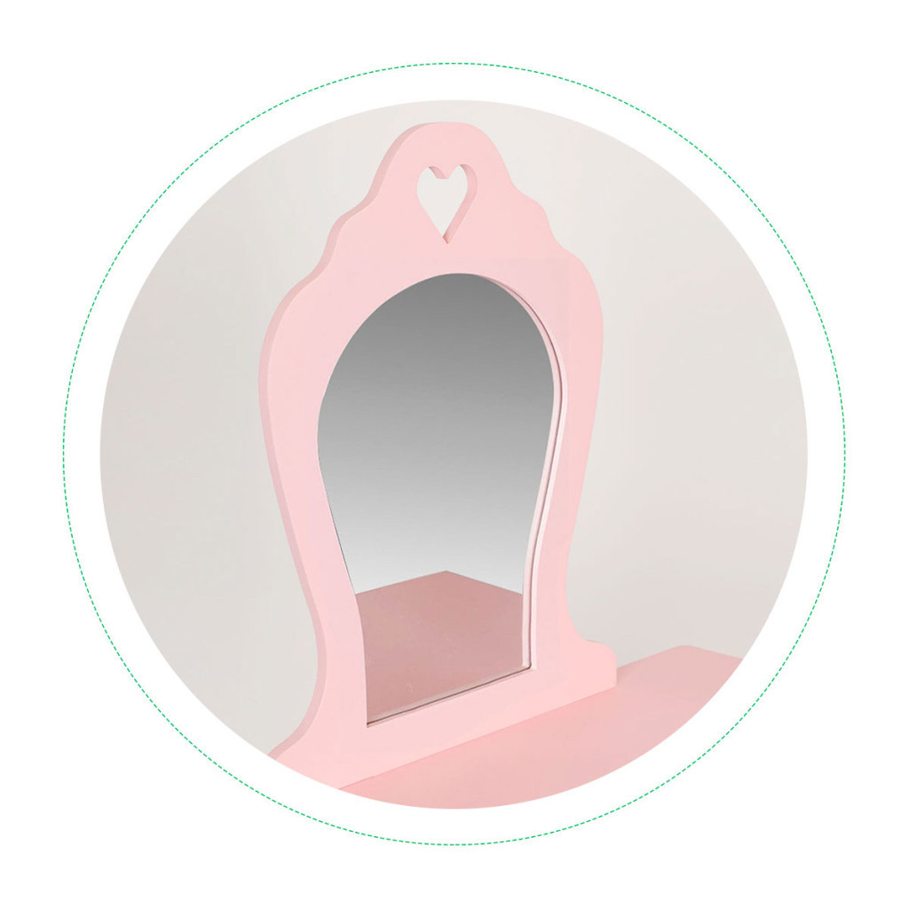 Caracteristica principală a acestei mese de toaletă este oglinda mare, decorativă, care adaugă farmec și permite fetițelor să-și vadă hainele și să se bucure de joacă. Oglinda are o formă frumoasă, sporind eleganța măsuței de toaletă, păstrându-i în același timp aerul de fetiță.