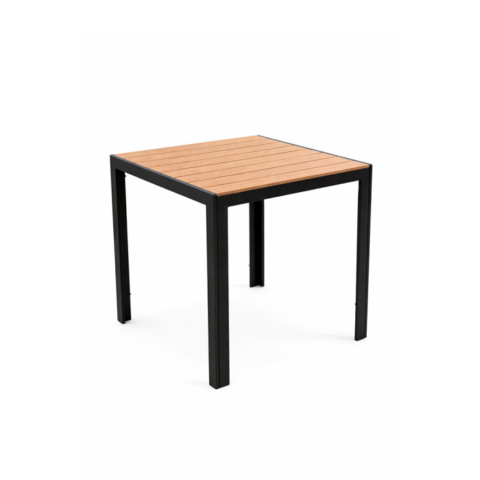 Rama metalică a mesei este finisată cu un strat de pulbere, oferind structurii un aspect uniform. Cele patru picioare pătrate sunt poziționate în colțurile blatului mesei, conferind mesei o structură fixă, stabilă. Blatul mesei are un finisaj cu efect de lemn, care amintește de lemnul natural.