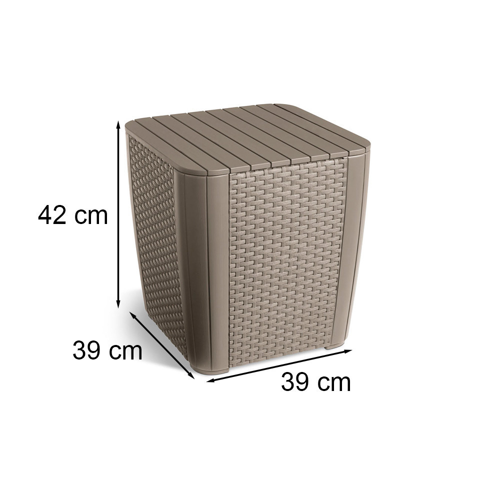 Spațiul de depozitare încorporat oferă un loc ideal pentru a depozita obiecte mai mici, cum ar fi unelte de grădină sau chiar jucării. Acest dispozitiv de depozitare ajută și la menținerea ordinii, în timp ce partea superioară a mesei poate fi folosită în continuare ca măsuță laterală sau măsuță de cafea.