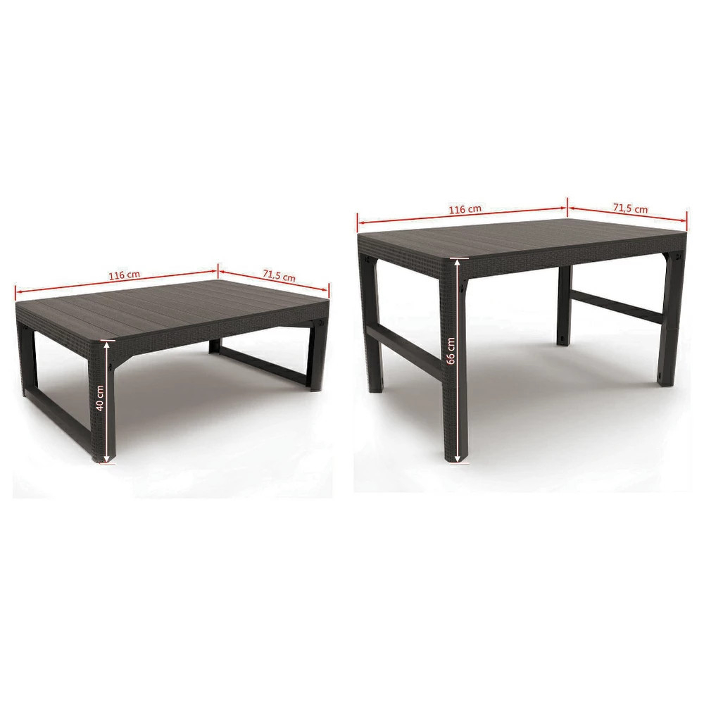 Blatul mesei Lyon este plat, ceea ce facilitează așezarea paharelor și farfuriilor. Masa poate fi lăsată independentă fără a vă face griji că își va pierde culoarea originală atunci când este expusă la lumina soarelui. Potrivit pentru scaunele Keter, Allibert și Curver. Are picioare pliabile, ceea ce economisește spațiu în timpul depozitării.