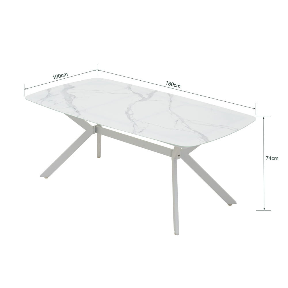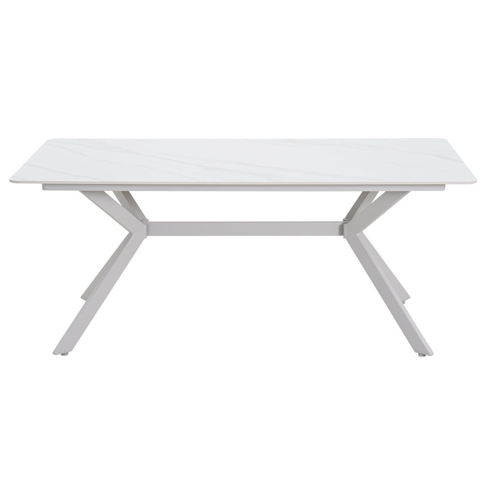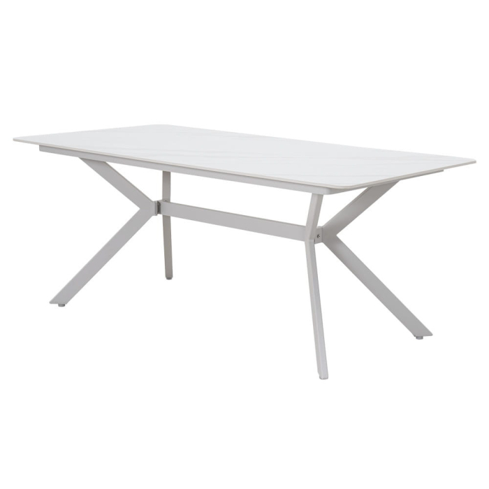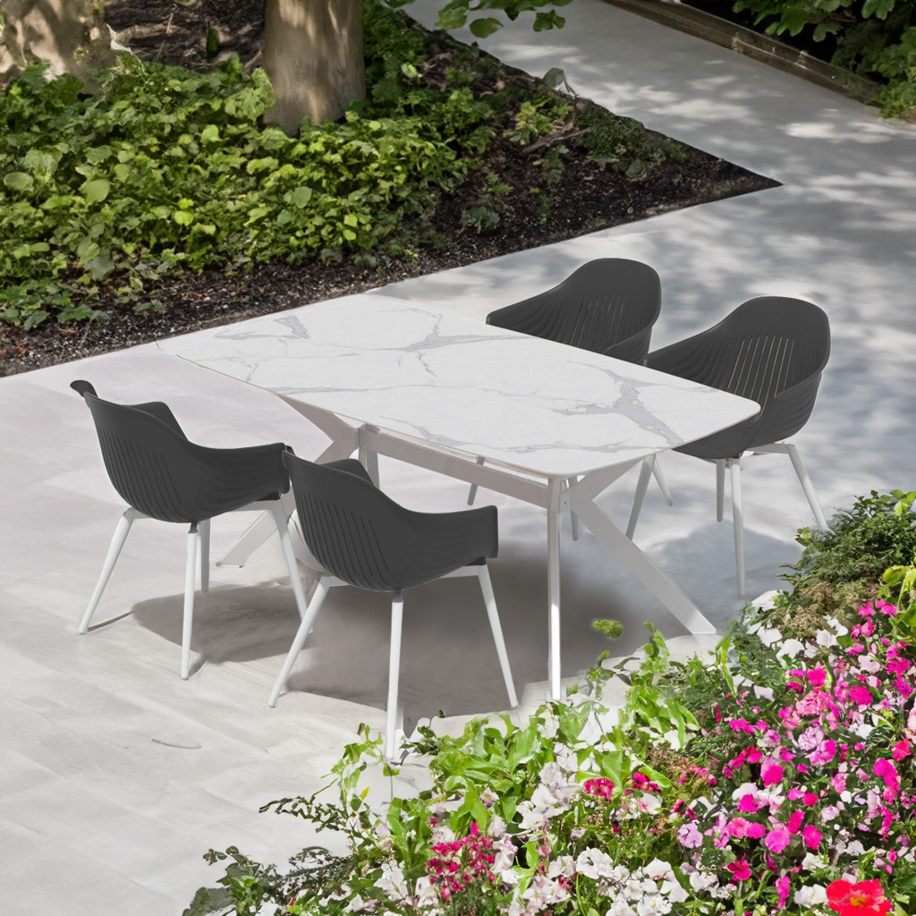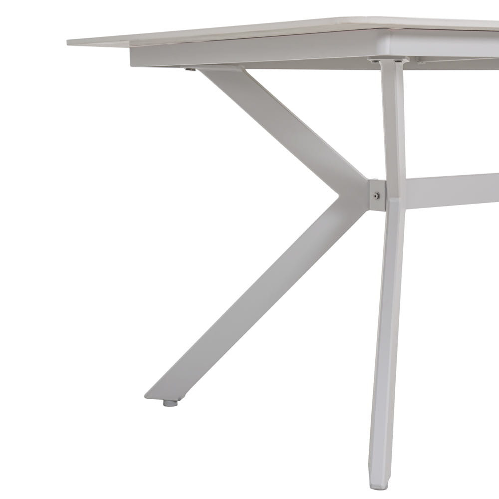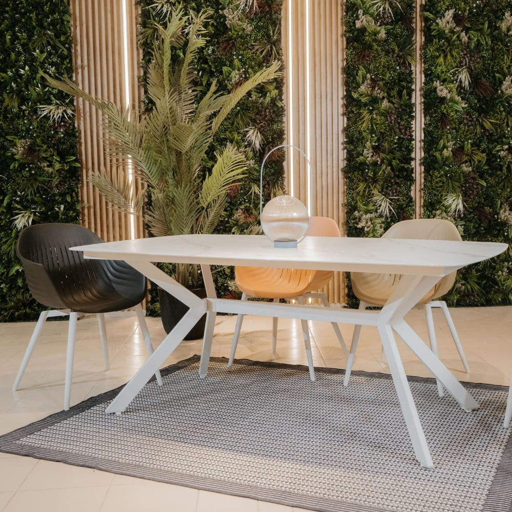 Rama din aluminiu vopsit în câmp electrostatic garantează nu doar durabilitate, ci și eleganță, integrându-se cu ușurință într-o gamă largă de stiluri de grădină și terase. Datorită rezistenței sale la coroziune, masa de grădină va rezista mai mult timp. Blatul din sticlă de culoarea marmurei albe îi conferă un caracter luminos și modern, creând locul perfect pentru relaxare în aer liber.