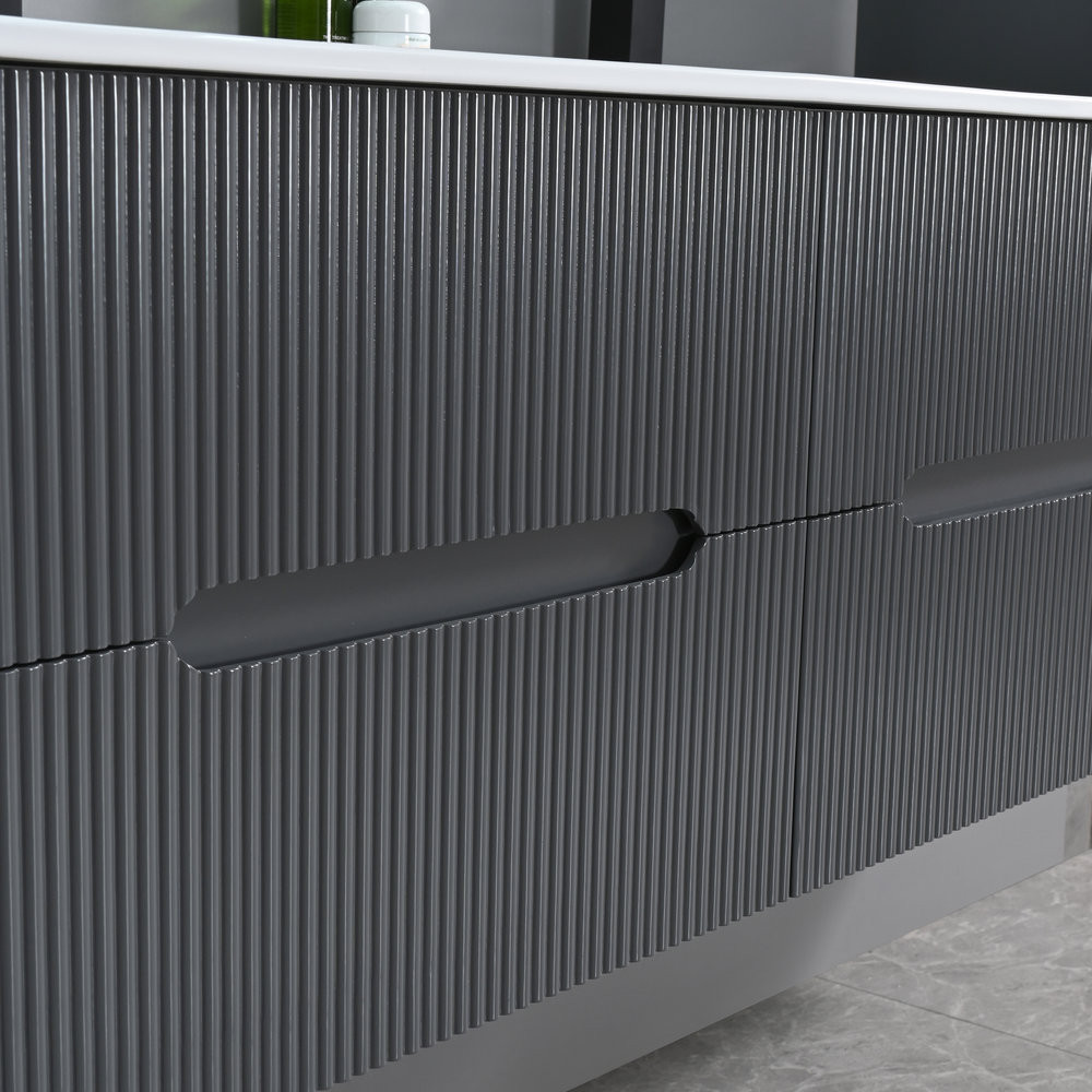 Mobilierul de baie Leziter Trent combină armonios estetica și caracterul practic. Panoul frontal canelat îi conferă un caracter curat și modern, în timp ce mânerul integrat îl face comod de utilizat. Fixarea pe perete creează un aspect fără efort și face curățarea podelei mai rapidă.