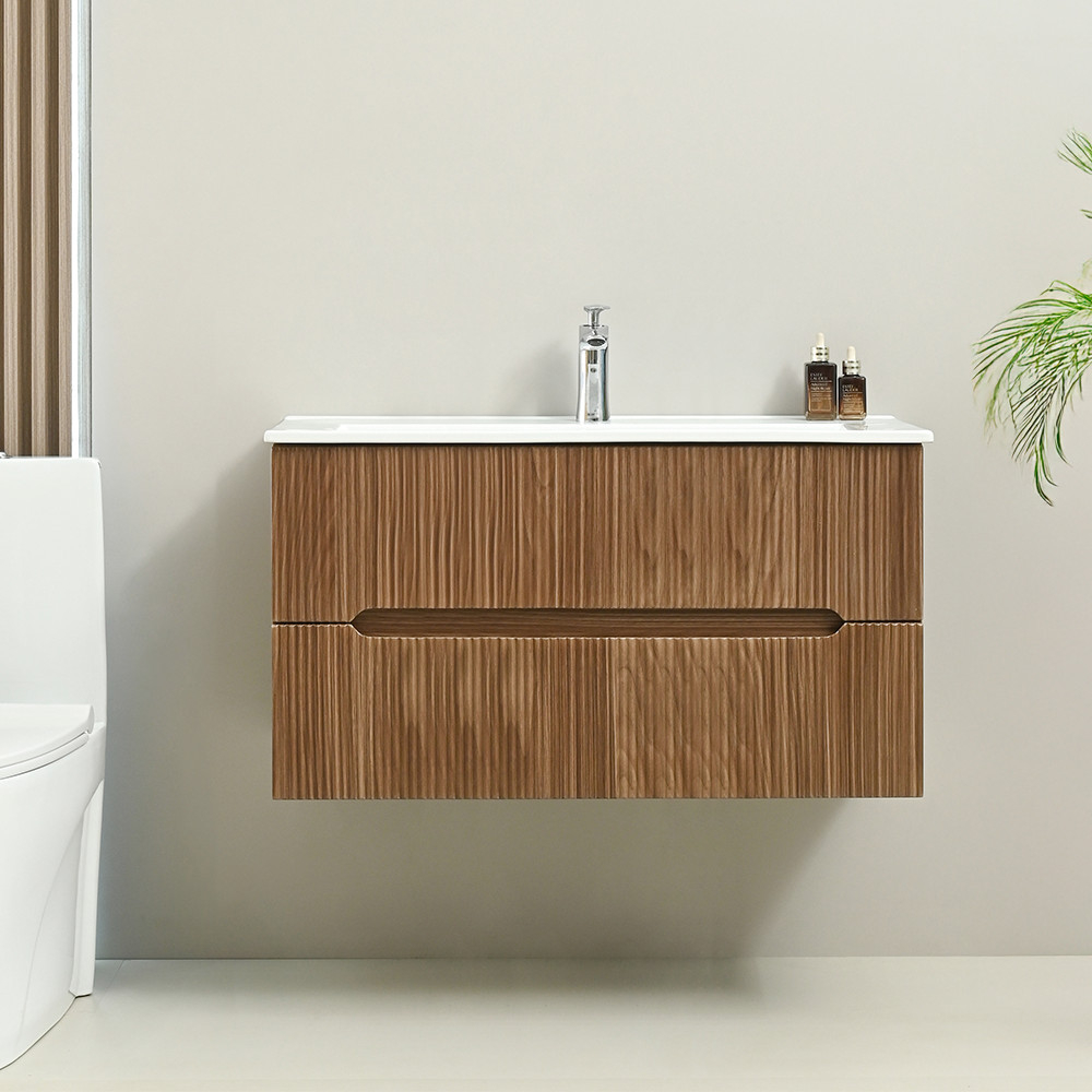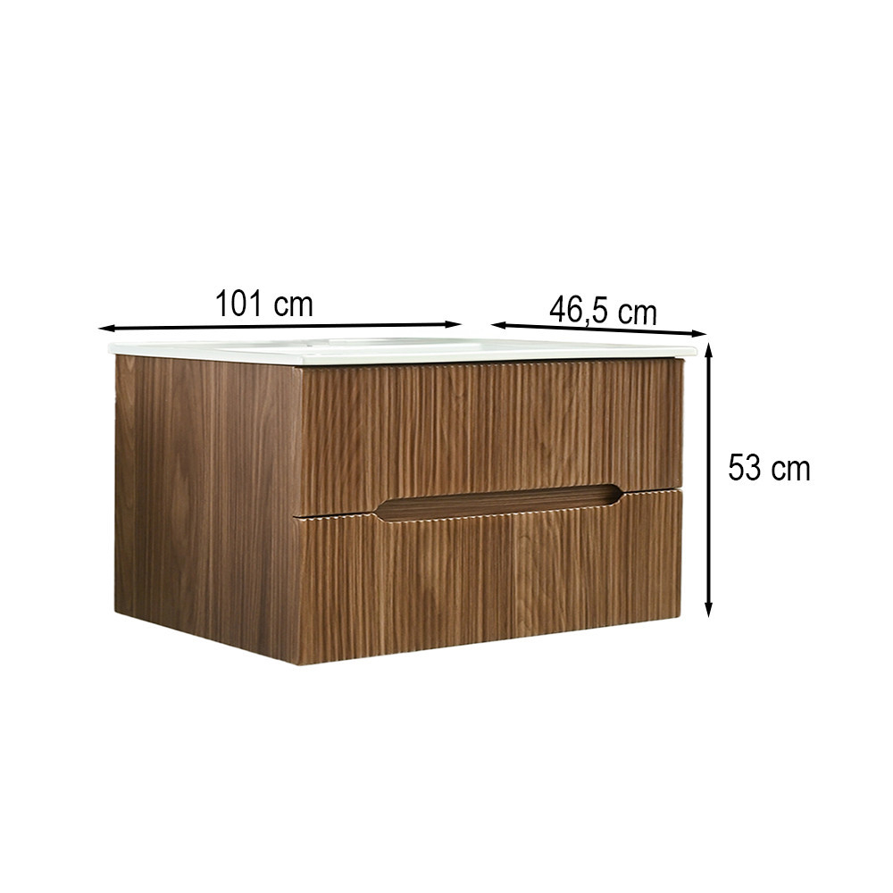 Dulapurile de baie Trent 100, montate pe perete, sunt o bijuterie curată și naturală. Culoarea caldă a stejarului apus de soare și fațada distinctivă, cu fibre verticale, aduc un efect natural spațiului, în timp ce designul modern, minimalist, se integrează cu ușurință în orice stil de interior.
