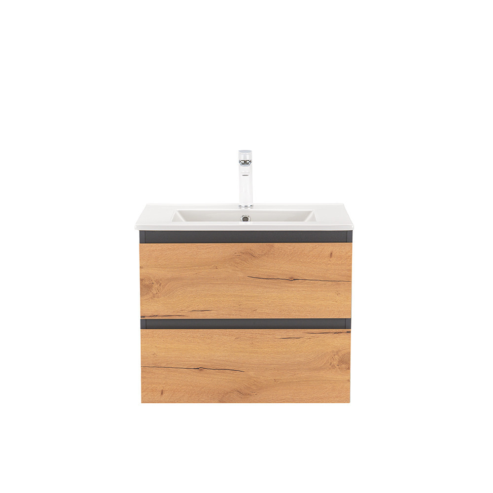 Mobilierul complet de baie Vario Forte 60 este o alegere elegantă și practică pentru o baie modernă. Dimensiunile sale compacte sunt ideale pentru băi mici și medii, închiderea la margine la 45 de grade conferă spațiului un efect modern, iar designul antracit-stejar îi conferă un aspect elegant. Sertarul cu închidere silențioasă și designul suspendat oferă confort și curățare ușoară, în timp ce materialele de calitate asigură o durată lungă de viață.