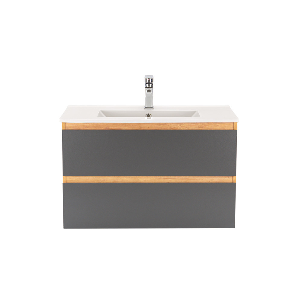 Mobilierul complet de baie Vario Forte 80 este o alegere elegantă și practică pentru o baie modernă. Dimensiunile sale compacte sunt ideale pentru băi mici și medii, închiderea la margine la 45 de grade oferă un efect modern, iar designul stejar-antracit conferă spațiului un aspect elegant. Sertarul cu închidere silențioasă și designul suspendat oferă confort și curățare ușoară, în timp ce materialele de calitate asigură o durată lungă de viață.