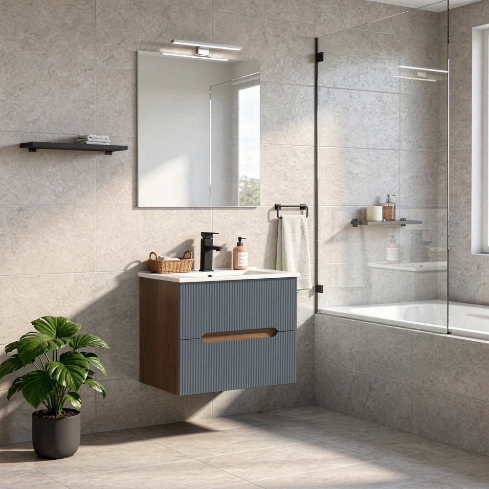 Mobilierul de baie Leziter Trent combină armonios estetica și caracterul practic. Panoul frontal canelat îi conferă un caracter curat și modern, în timp ce mânerul integrat permite o utilizare convenabilă. Fixarea pe perete creează un aspect fără efort și face curățarea podelei mai rapidă. Chiuveta din ceramică este durabilă, atemporală, rezistentă la uzura zilnică și ușor de păstrat curată.