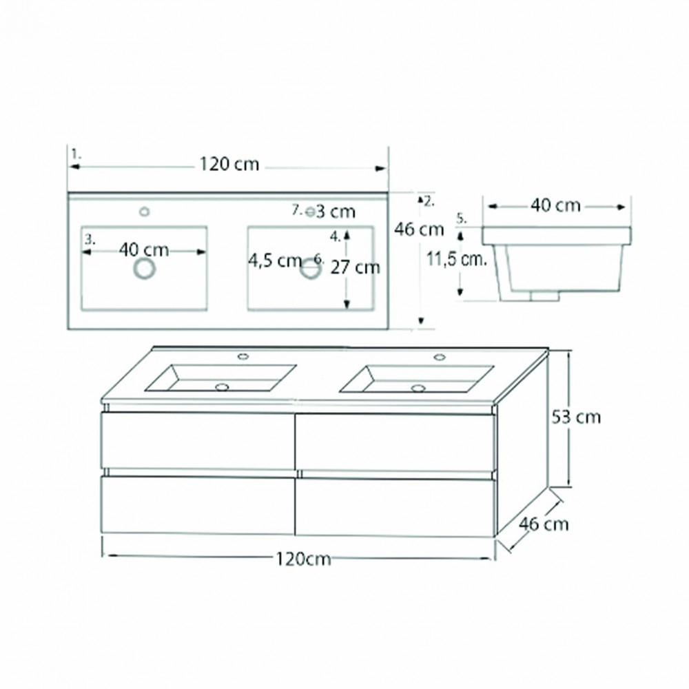 Mobilierul de baie are patru sertare spațioase unde pot fi depozitate convenabil articolele de toaletă. Datorită designului său compact , este potrivit și pentru mobilarea băilor mai mici, de exemplu în apartamentele cu panouri. Produsul este fabricat din plăci de mobilier de înaltă calitate și este prevăzut cu margini asortate în culori . Mobilierul de baie este disponibil în versiune suspendată .