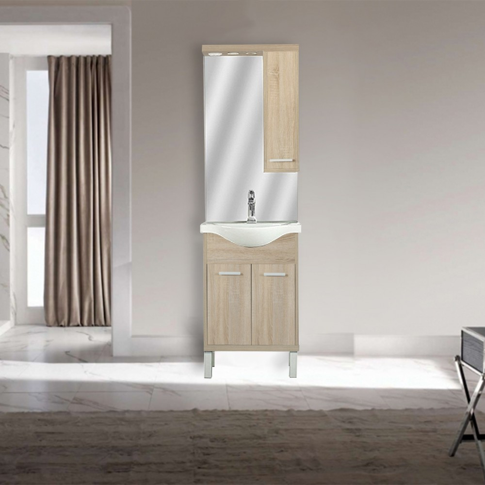 Mobilierul de baie ocupă puțin spațiu, dar are un dulap spațios unde pot încăpea confortabil articole de toaletă pentru baie. Datorită spațiului redus necesar, este potrivit și pentru mobilarea băilor mai mici, de exemplu în apartamentele cu panouri. Produsul este fabricat din plăci de mobilier de înaltă calitate și este prevăzut cu margini asortate în culori . Mobilierul de baie este disponibil cu lavoar .