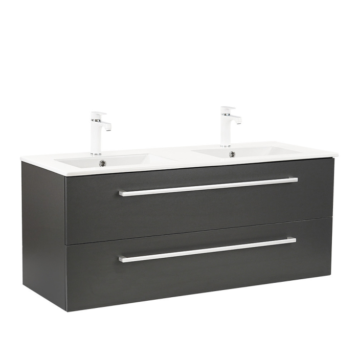 Mobilierul complet de baie Vario Clam 120 este o alegere elegantă și practică pentru o baie modernă. Dimensiunile sale compacte sunt ideale pentru băi mici și medii, iar profilul metalic al mânerului conferă un efect de patină, în timp ce designul antracit-antracit conferă spațiului un aspect elegant. Sertarul cu închidere silențioasă și designul suspendat oferă confort și curățare ușoară, în timp ce materialele de calitate asigură o durată lungă de viață.