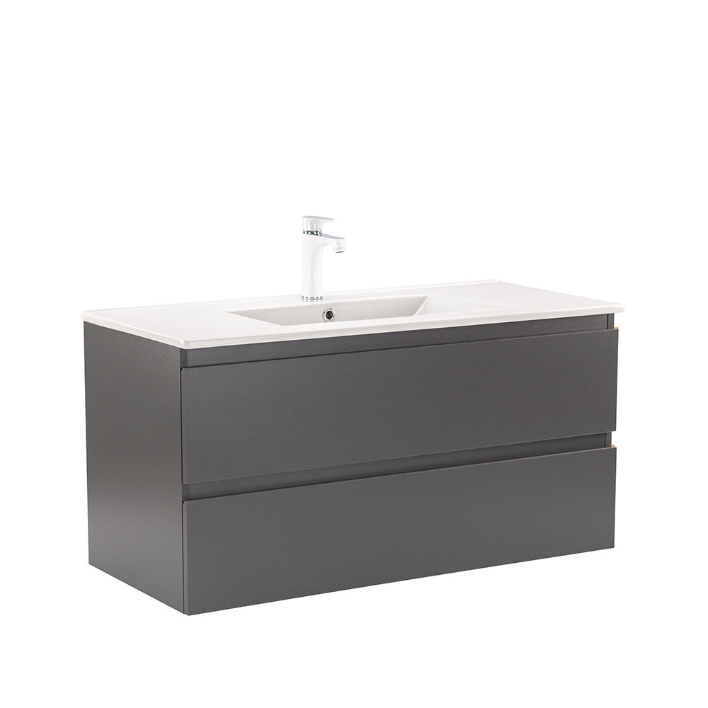 Mobilierul complet de baie Vario Forte 100 este o alegere elegantă și practică pentru o baie modernă. Dimensiunile sale compacte sunt ideale pentru băi mici și medii, închiderea la margine la 45 de grade conferă spațiului un efect modern, iar designul antracit-antracit îi conferă un aspect elegant. Sertarul cu închidere silențioasă și designul suspendat oferă confort și curățare ușoară, în timp ce materialele de calitate asigură o durată lungă de viață.