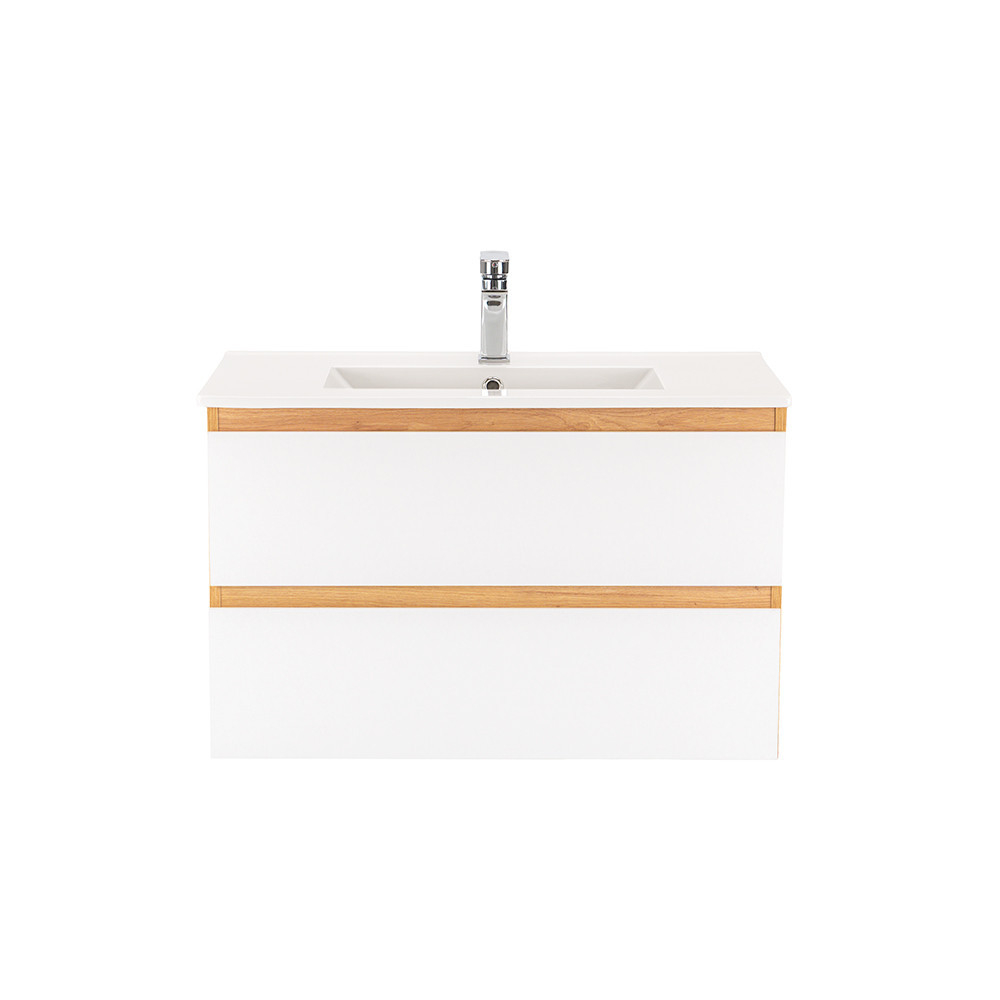 Mobilierul complet de baie Vario Forte 80 este o alegere elegantă și practică pentru o baie modernă. Dimensiunile sale compacte sunt ideale pentru băi mici și medii, închiderea la margine la 45 de grade oferă un efect modern, iar designul alb-stejar conferă spațiului un aspect elegant. Sertarul cu închidere silențioasă și designul suspendat oferă confort și curățare ușoară, în timp ce materialele de calitate asigură o durată lungă de viață.