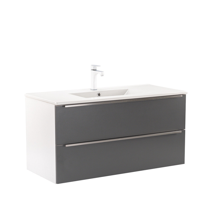 Mobilierul complet de baie Vario Trim 100 este o alegere elegantă și practică pentru o baie modernă. Dimensiunile sale compacte sunt ideale pentru băi mici și medii, iar profilul metalic al mânerului conferă un efect de patină, în timp ce designul alb-antracit conferă spațiului un aspect elegant. Sertarul cu închidere silențioasă și designul suspendat oferă confort și curățare ușoară, în timp ce materialele de calitate asigură o durată lungă de viață.